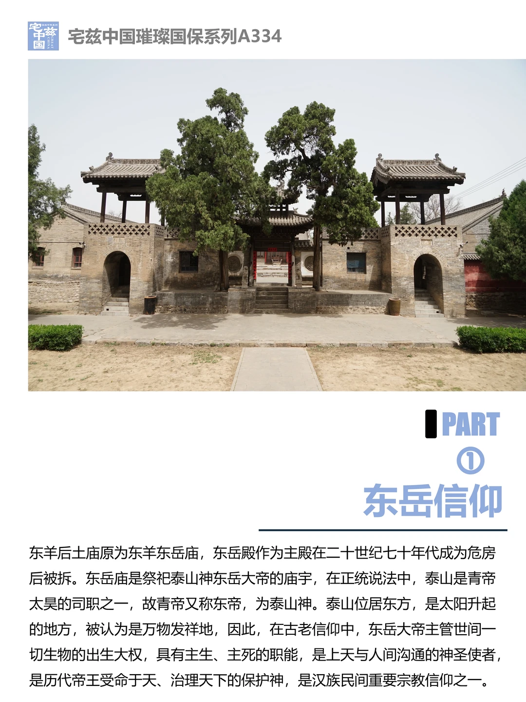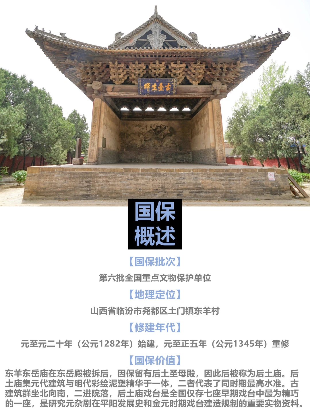 东羊东岳庙在东岳殿被拆后,因保留有后土圣母殿,因此后来被称为后土庙。后土庙集元代建筑与明代彩绘泥塑精华于一体,二者均代表了同时期的最高水准。后土庙古建筑群坐北向南,为二进院落,中轴线自南向北依次保存有山门、戏台、牌楼、钟鼓楼、东西配殿、东岳殿(遗址)、圣母殿、耳房等。圣母殿中的明代雕塑为艺术精品。戏台是全国仅存七座早期戏台中最精巧的一座,是研究元杂剧在平阳发展史和金元时期戏台建造规制的重要实物资料。