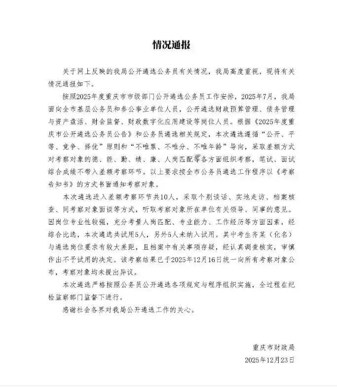 惊了!公务员遴选双第一惨遭淘汰!差额考察到底卡掉了谁? 太颠覆认知了!重庆33岁男子齐某,公务员遴选笔试、面试双双拿下第一,所有人都以为他稳上岸,结果公示名单里根本没他!这事儿一出来,评论区直接炸了:“分数第一都不行?难道有黑幕?”别急,这背后的“差额考察”制度,才是关键! 先划重点:这次遴选10人进考察,只录5人,核心就是“差额考察”——不唯分数取人!很多考生都踩过一个坑:觉得考高分就万事大吉。但实际上,笔试面试只是敲门砖,真正的“终极筛选”在考察环节!档案核查、实地走访、一对一谈话,查的是你实际工作能力、专业对不对口、综合素质过不过硬,目的就是杜绝“高分低能”。 齐某为啥被刷?官方直接点明两个硬伤:一是和岗位不匹配,二是档案有疑点。他报考的是财政局“综合管理2”岗,要做预算改革、债务管理这种硬核财政工作,但他学的是土木工程造价和工商管理,虽符合报考条件,专业契合度差太远。更关键的是,公务员档案审查是“一票否决”,有任何疑点都可能出局!而且规则早写明白了:笔试面试成绩不带入考察,考察是独立评判! 有人肯定要问:这考察是不是“暗箱操作”?其实不然,差额考察的初衷是找“最适合岗位的人”,而不是“最会考试的人”。查档案保清白、走访看真实工作表现、面谈测应变能力,都是为了贴近实际工作场景。但不可否认,考察过程透明度不够,公众只能看到分数,看不到具体评判标准,才容易产生质疑。 这事儿也给所有考公人提了个醒:别盲目“冲岗”!报考前一定要摸清岗位需求,评估自己的匹配度,别只看“能报考”就往上冲。“上岸”不是最终目的,能适配岗位、长期发展才是关键。而对选拔制度来说,既要保证公平,又要兼顾实效,未来把考察标准细化、公开化,才能让大家真正信服。 说到底,公务员选拔从来不是“分数游戏”,而是人才与岗位的精准匹配。摒弃“分数至上”的执念,才能看懂背后的用人逻辑。每一次这样的热议,都是推动制度完善的动力。你觉得差额考察该怎么提高透明度?评论区聊聊你的看法!