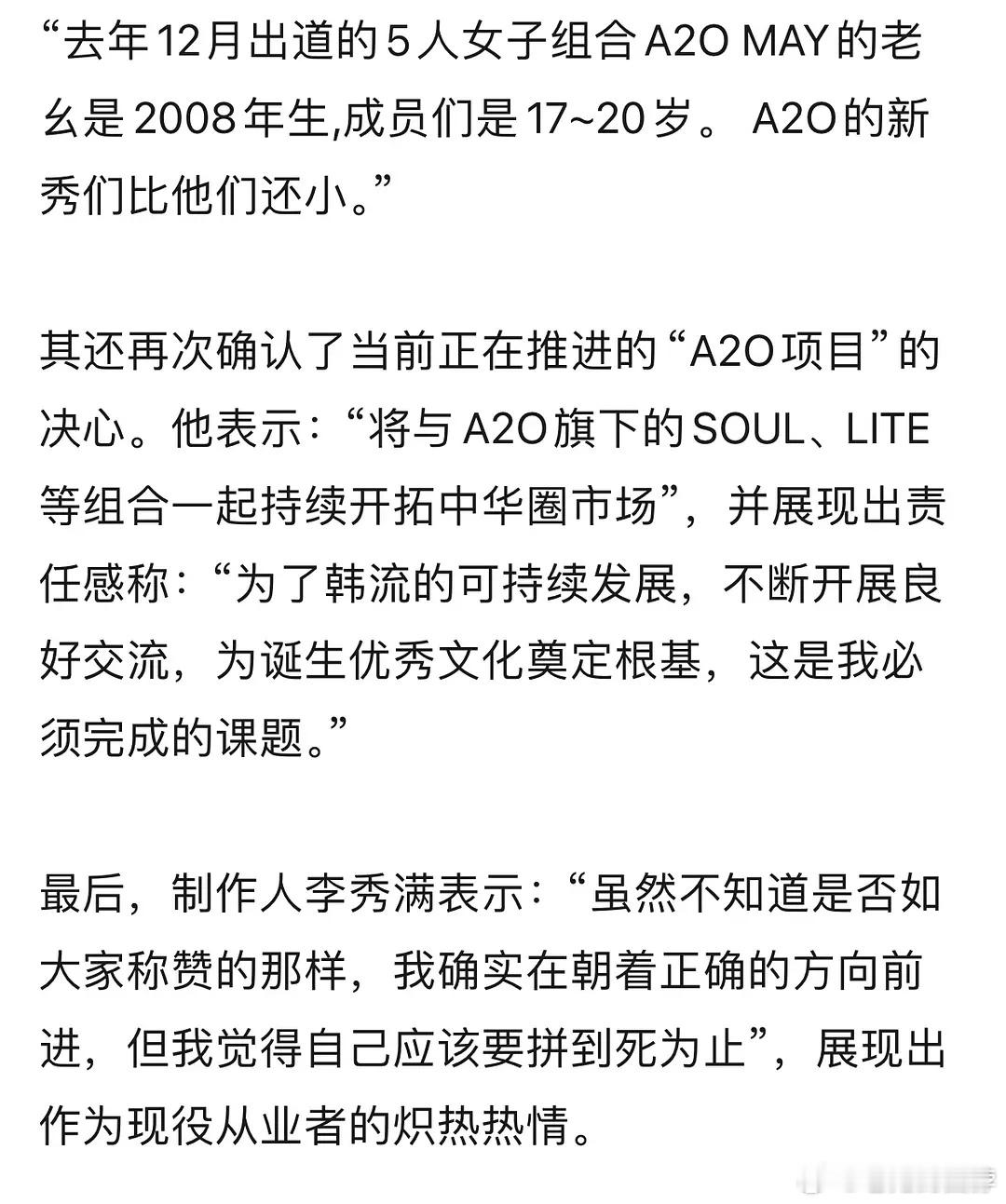 李秀满明年要出两个组合 李秀满说,要拼到自己死为止大概就是明年要推两个韩团,一个叫soul(男团),一个叫lite(这个不知道是女团男团),年纪都在09年以后,都要闯中