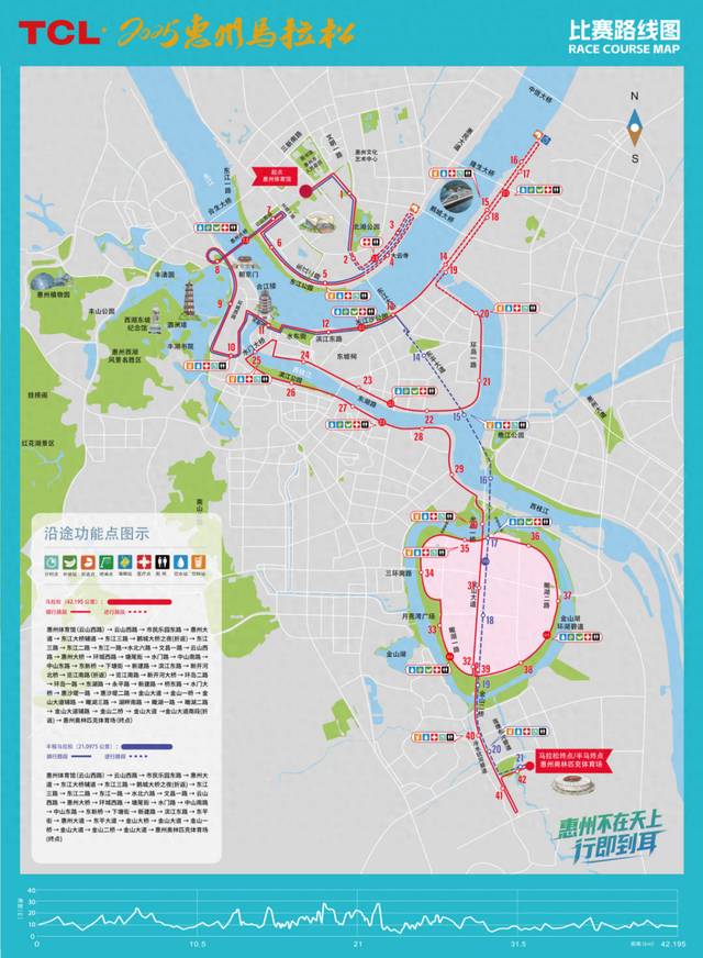 1.全程马拉松(42.195KM):惠州体育馆(云山西路起点)→云山西路→市民乐园东路→惠州大道→东江大桥辅道→东江三路→鹅城大桥(折返)→东江三路→东江二路→东江一路→水北六路→文昌一路→云山西路→惠州大桥→环城西路→塘尾街→水门路→中山南路→中山东路→东新桥→下塘街→新建路→滨江东路→新开河北桥→览江南路(折返)→览江南路→新开河北桥→环岛二路→环岛一路→东湖路→永平路→新建路→桥东路→水门大桥→惠沙堤一路→惠沙堤二路→金山大道→金山一桥→金山大道辅道→瞰湖三路→湖畔南路→瞰湖一路→瞰湖二路→金山大道辅路→金山二桥→金山大道→金山大道南段(折返)→惠州奥林匹克体育场(终点)。