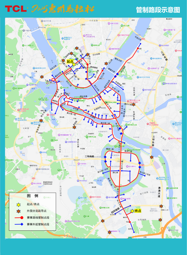 按照2025惠州马拉松起点道路、赛事道路及其外延道路实施交通管制,具体如下: