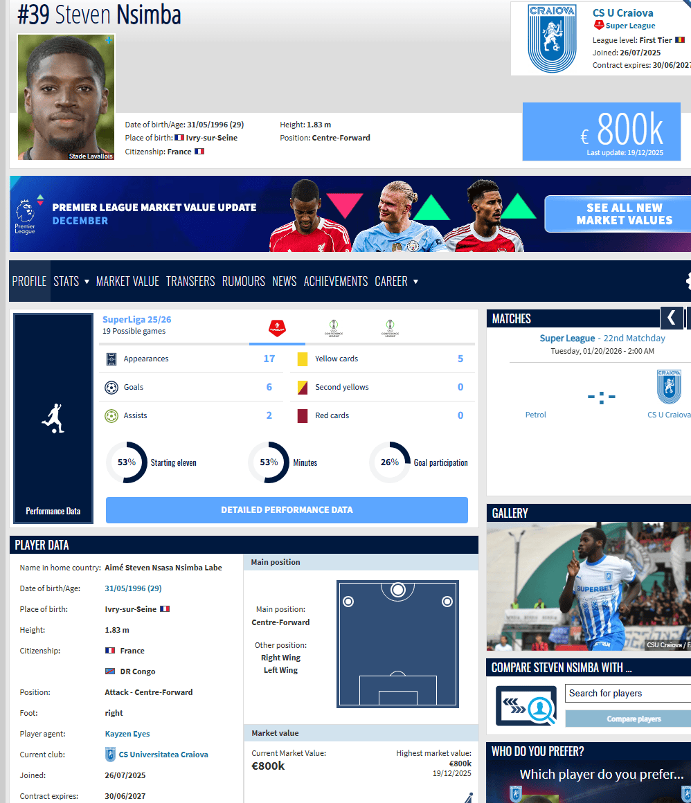 史蒂文-恩辛巴以自由球员身份加盟克拉约瓦大学队,此前他效力于法国第三级别联赛球队(法全国联赛)奥巴涅。这位法国前锋与球队签约至2027年。