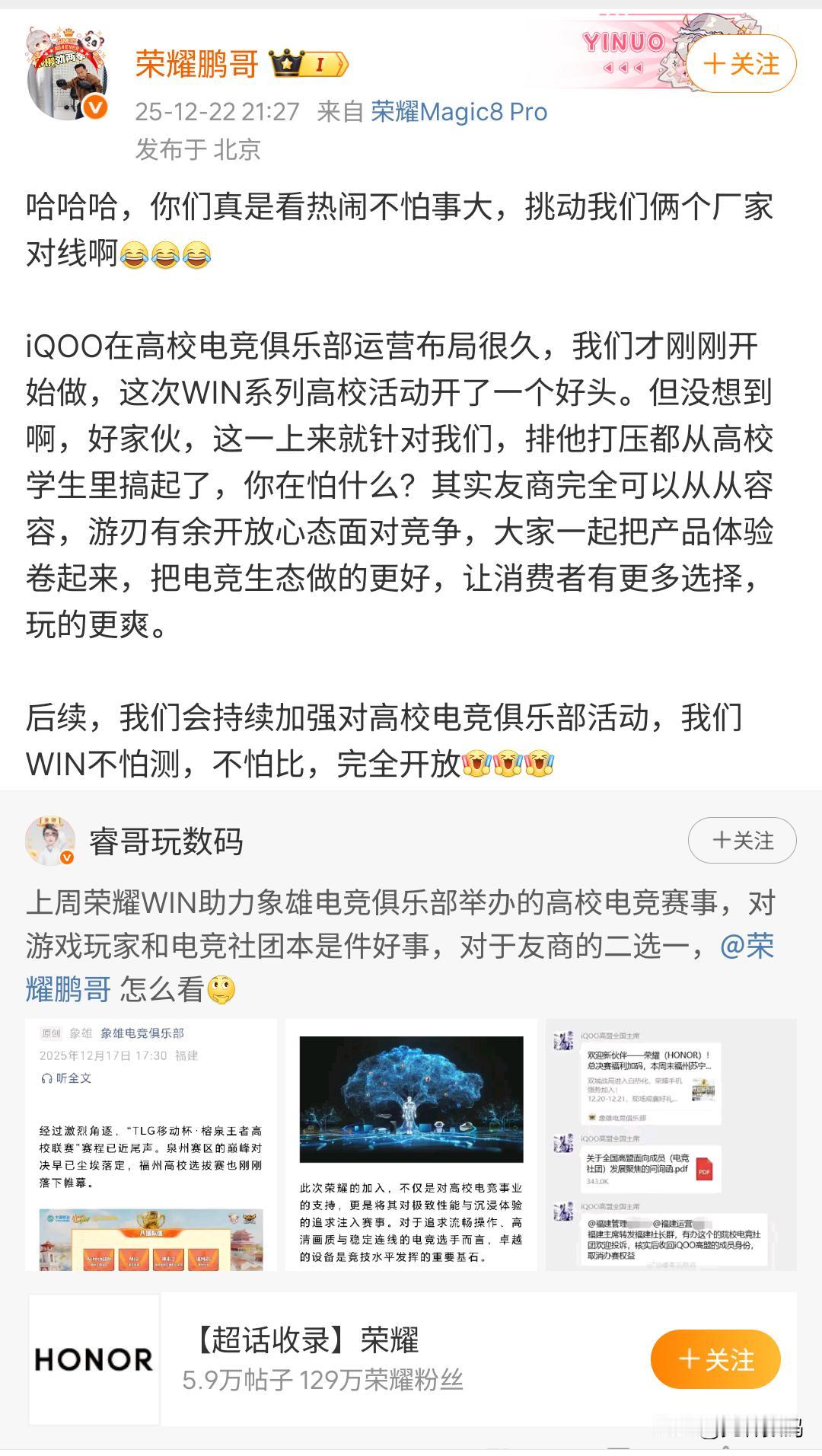 坏了,感觉iQOO要被偷家了呀,难怪会和荣耀掐起来! 前两天荣耀宣布把GT系列更名为WIN系列后,我就觉得这个“WIN/赢”就那么重要吗?并且这个系列还自带风扇,再加上大电池,明显就是冲着性能、冲着电竞手机这个赛道来的。 看到这里都觉得没啥,毕竟这些年手游发展那么猛,大家堆料也很正常。但是后面我发现荣耀WIN系列居然跟成都AG超玩会合作了,并且AG一诺更是成为了荣耀WIN系列的代言人,这就有点火药味了。。。 为啥这么说呢? 因为王者荣耀的最重要的比赛KPL一直都是iQOO在赞助,iQOO早在2019年刚开始出手机没多久就开始赞助KPL,越到后面合作越深,这也是为啥我们看到很多王者荣耀比赛上有iQOO的广告,然后最后颁奖给FMVP的时候,还会把手机拿出来亮相的原因(比赛用机)。今年KPL在鸟巢举办更是成为焦点,双方都达到一个新的高度。一点不夸张的说,iQOO和KPL,和王者荣耀是相互成就,相互成长起来的。 我记得iQOO出来没多久就跟KPL合作上了(2019年),并且合作后就一直没断过,也没变过(具体记不清了)。至于次一点的K甲联赛、还有其他杯赛,我记得是有其他品牌赞助过,但是因为影响力不如KPL,断断续续的,形成不了气候。 总之一句话,王者荣耀最主要的比赛就是KPL,KPL也是王者荣耀关注度最高的比赛,而KPL跟iQOO一直是合作关系,iQOO自从跟王者荣耀合作过后就再也没断过,iQOO是比赛用机,也是金主爸爸,投钱了自然就是为了换取曝光提升知名度嘛。 但是现在荣耀WIN直接赞助了KPL里最强的队伍——AG,并且还把AG里最红的一诺作为代言人。这一招真的有点厉害,相当于直接大招偷家。 KPL是王者荣耀的最高规格的职业联赛,但说实话,前期很多人并不怎么关注这个比赛,iQOO押宝这个赛事并且一直有合作,去推广自己。但是iQOO赞助的是这个联赛,并不是赞助队伍,这里面就有bug(这让我想起了当年李宁赞助CBA,然后易建联在比赛的时候穿耐克(易建联是签约了耐克))。 另外,一般这种专业性较强的赛事赞助,一般来说是不能出行竞品的,这个就要看联赛跟赞助商签合同的时候是怎么要求的(这就是为啥国内有线比赛穿钩子的时候要把logo遮起来是一样,但是NBA的球鞋可以穿自己的赞助,因为球鞋是放开的)。 所以荣耀这一波玩得挺鸡贼的,毕竟你iQOO是赞助了KPL联赛,而我找的是代言人,并不冲突。只是这个代言人不是娱乐明星和体育明星,而是一支电竞队伍和职业游戏选手(名气最大的那种)。 现在AG和一诺有了名气(一诺对于王者荣耀,大概就是当年NBA里的乔丹,妥妥滴当红炸子鸡,王者荣耀的人气王),既然比赛的时候我管不了,那我就私底下赞助队伍和赞助个人(这又让我想起了某届奥运会,打比赛和上领奖台的领奖服logo之争)。 在队伍或者赛事没出名前,大家都不愿意投钱怕打水漂,发现潜力股或者打出身价有知名度了,大家都想来分一杯羹。 所以iQOO多多少少感觉有点被人摘桃子,但是别人的做法你好像又挑不出什么毛病,搞得很窝囊。 从iQOO的角度来说,我赞助KPL这么多年,双方慢慢磨合运营才把这项赛事推到目前这个体量,耕种了这么多年,好不容易有点知名度了,你居然直接偷家把最好的队伍、最好的人员签下来了?再说王者荣耀这个盘子就这么大,赞助一个KPL都收效甚微,我总不能把所有队伍所有人员都签下来吧,这样投入跟产出根本不成比例。 从荣耀的角度来说,你签约的是KPL这个联赛,又不是把所有队伍所有人员都签了,比赛用机你签约了那我就签个人代言或者团队代言,比赛用机还是你的,但是我签约用来直播,或者在社交平台上活跃,也没有影响到你的核心利益。你也不能因为你签约了KPL就想把整个市场吃完吧? 站在双方的角度貌似都有理,所以这事谁对谁错还不好说,只是现在双方难免会被推到对立面。因为iQOO赞助了KPL,同时也在搞一些次级联赛和活动,荣耀签约了AG和一诺,自然也是想从王者荣耀的一些赛事(KPL除外)和活动切入进去分一杯羹。 只是结合这个事情,理一下来龙去脉。但荣耀和iQOO这两家接下来是握手言和一起发展(各自赞助一些),还是就此结下梁子,我们拭目以待。 不过我到觉得,目前最难受的应该是KPL,如果因此得罪了iQOO,后面不再赞助了,那么将会损失一大金主【当然,也不排除iQOO退出后会有其他品牌接手】 最后,这个鹏哥直接这样公开喊话【爱哭会输】,实在太败人品了!