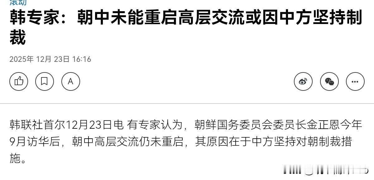 韩国媒体爆了一个大消息!韩媒称,中国跟朝鲜在一个问题上有不小的分歧!12月23日,根据韩联社报道,韩媒援引专家观点声称,朝鲜国务委员会委员长金正恩今年9月访华后,朝中高层交流“仍未重启”,其原因在于中方坚持对朝制裁措施。 韩媒表示,与俄罗斯不同,中国坚持实现朝鲜无核化和落实联合国对朝制裁的立场,这是朝中今年下半年“未能重启”高层交流的核心原因。对于韩媒的这一论调,我们怎么看呢?恐怕这一报道与事实完全不符。事实上,中朝之间的高层外交非常的密切,而不是所谓的朝中高层交流“仍未重启”。 事实上,今年九月份,朝鲜外相崔善姬就访问了中国。其后,十月份,我们的总理访问朝鲜,并出席了重要活动。十月份,中朝还共同举办抗美援朝出国作战75周年纪念活动。因此,韩媒的论调完全是无稽之谈。而至于所谓的中方坚持对朝制裁措施,这也与事实不符。 半岛无核化目标,我们始终是坚持的,我们也坚定维护联合国安理会相关决议的严肃性和权威性,但是我们明确反对制裁影响朝鲜的民生需求,更反对单边制裁和“长臂管辖”。因此,韩媒挑拨中朝关系,这明显是别有用心。或许,韩国国内想要离间中朝关系,孤立朝鲜,但这并不会得逞。