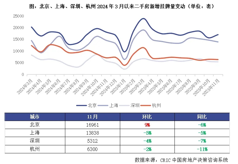 CRIC数据显示,2025年11月30个重点城市二手房成交环比上升14%,累计同比增3%。究竟当前二手房业主挂牌积极性如何?热点城市中新增挂牌房源又存在哪些结构性分化特征呢?