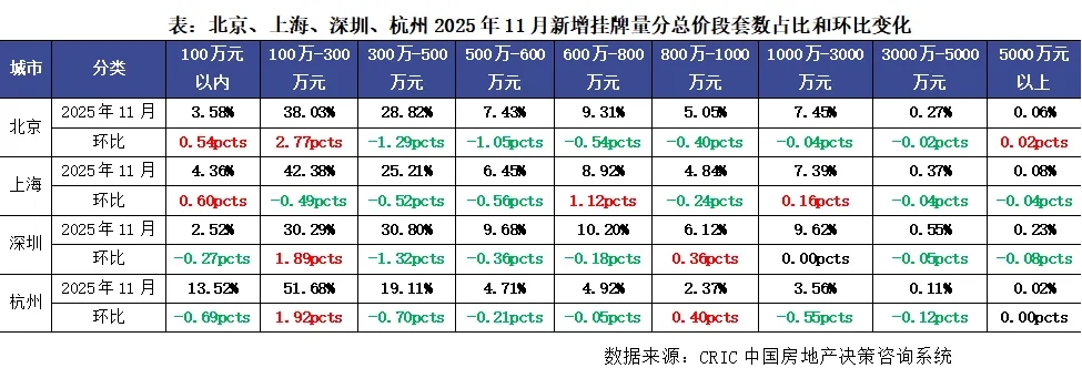京深杭新增挂牌100万-300万元以内房源占比上升、300万-600万元占比普降