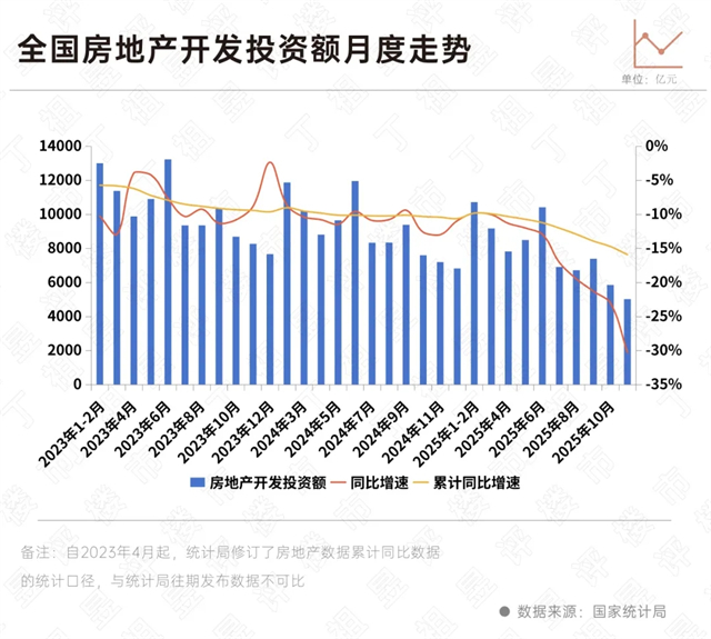 1—11月份,全国房地产开发投资78591亿元,同比下降15.9%,降幅高于同期新房销售额4.8个百分点。单看11月,开发投资额为5028亿元,同比下降30%,降幅较10月扩大7.3个百分点。