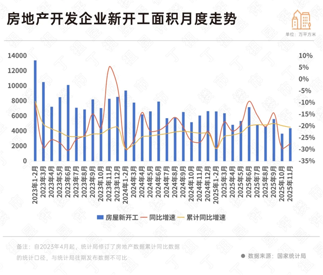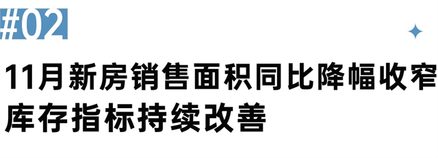 前11月房屋新开工面积5.3亿平方米,下降20.5%。其中,住宅新开工面积3.9亿平方米,下降19.9%。11月新开工面积4396万平方米,同比下降27.6%,同比降幅缩小1.9个百分点。
