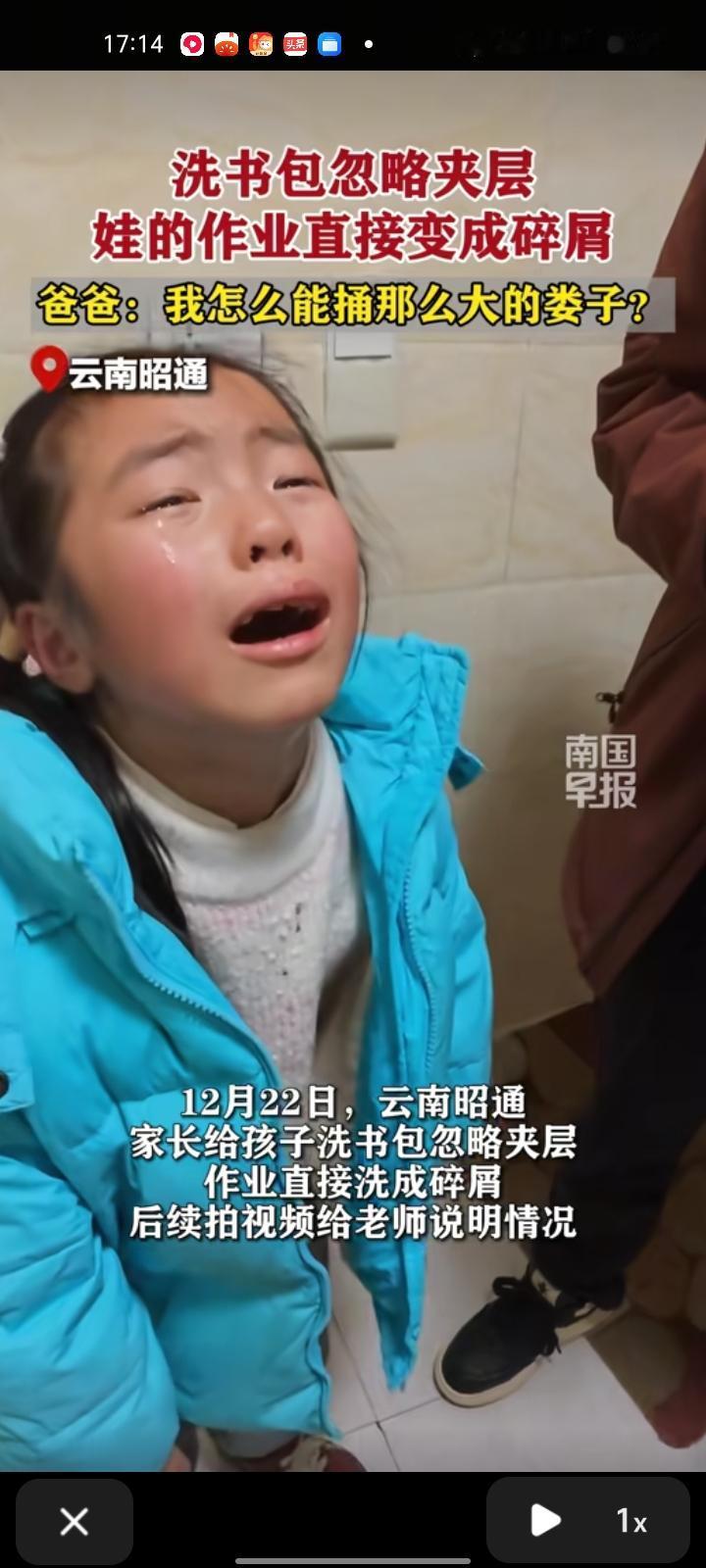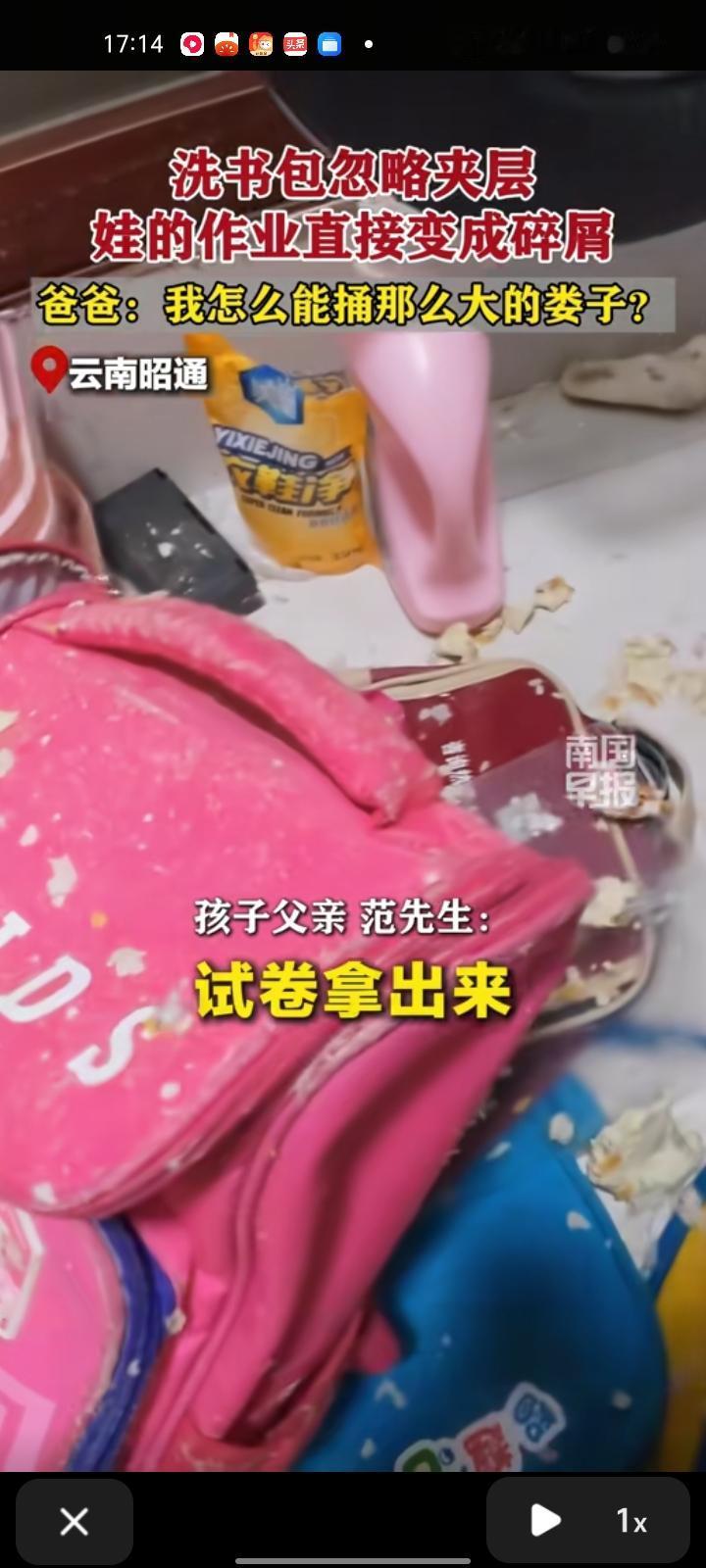 12月21日,云南昭通。家长给女儿洗书包忘了有夹层,作业在里面,作业直接被洗成碎屑,女儿看到后哭的不行了。后续家长拍视频给老师说明情况,老师回复称:没事。