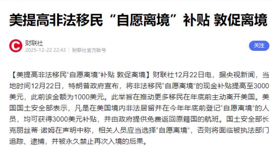 美国这招有点损 12月22日,特朗普政府突然宣布,把非法移民“自愿离境”的补贴从1000美元一口气涨到3000美元,还包年底前的免费机票。   说白了,这3000美元和免费机票,更像是给移民下的一道“选择题”,只是这道题的两个选项,一个是拿了钱“体面”离开,另一个就是等着被执法部门找上门,最后不仅要被强行遣返,还会被永久禁止再次入境。   特朗普政府会突然加码这一政策,核心原因其实很直白,就是之前的遣返目标没完成,还想省点钱。   要知道特朗普今年1月刚上任的时候,就拍着胸脯承诺要实现创纪录的遣返规模,目标是每年遣返100万非法移民,但从目前的数据来看,今年截至现在实际遣返的人数也就62.2万,离目标还差着一大截。   更关键的是强制遣返的成本高得吓人,美国国土安全部有过公开数据,要是靠执法人员去逮捕、拘留再遣返一名非法移民,平均下来要花1.7万美元。   反观现在的“自愿离境”政策,就算把3000美元补贴和免费机票的成本都算进去,每个人的花费也比强制遣返少太多,这波操作本质上就是用小钱换效率,还能给自己的移民政策贴个“人道”的标签。   为了让这招能落地,特朗普政府还专门搞了个配套的应用程序,名字叫CBP Home,就是让非法移民能自己在线上登记离境流程。   可能有人不知道,这个应用其实是改了个名字来的,之前拜登政府时期叫CBP One,那会儿主要是帮移民合法进入美国的,现在直接被拿来反向操作,变成了催促移民离开的工具。   不仅如此,政府还花了大价钱搞宣传,之前就有过耗资2亿美元的广告活动,画面里一边是移民被戴手铐押上飞机的场景,配文写着“如果美国移民与海关执法局找到你”,另一边又是笑脸盈盈的人拿着补贴登机的画面,明摆着就是用恐吓加利诱的方式逼移民就范。   顺着这个逻辑往下想,这3000美元的补贴根本不是什么善意的福利,反而藏着不少隐性的限制。   首先时间卡得特别死,必须要在今年年底前完成登记并离境才能拿到钱,这就给移民造成了很大的时间压力,根本没多少时间去琢磨利弊或者寻求法律帮助。   其次,拿到这笔钱的前提是“自愿”放弃所有申诉的权利,也就是说一旦登记离境,就算之前有申请庇护或者合法身份的诉求,也都彻底作废了,未来再想合法进入美国更是难上加难。   对很多移民来说,这根本不是自愿选择,而是在高压政策下的无奈妥协,毕竟比起被强行逮捕遣返,拿点钱体面离开似乎成了相对不那么糟糕的选项。   更值得留意的是这次提高补贴只是特朗普政府收紧移民政策的其中一步,在此之前他们已经搞了不少动作。   就在上个月,特朗普还在社交媒体上宣布要“永久暂停”来自所谓“第三世界国家”的移民,国土安全部也跟着暂停了新的庇护裁决,还在重审来自19个“关注国家”的身份申请,要是审查时被认为有“风险”,就算已经拿到合法身份都可能被撤销,甚至面临驱逐。   这种全方位的高压氛围,让不少移民社区早就陷入了恐慌,很多人就算有合法居留的资质,也担心哪天政策变了就会受到波及。   事实上,这波“自愿离境”政策的推行,已经开始对美国社会产生一些隐性影响。美国很多关键行业,比如建筑业、酒店业还有农业,都高度依赖移民劳动力,之前就有数据显示,随着移民的大量离开,这些行业的离职率已经在不断攀升。   有经济学家就分析过,这么大规模的移民离开会让美国的劳动力市场变得更紧张,企业很难找到工人,最后很可能会导致商品和服务价格上涨,这些成本最终还是会落到美国普通民众身上。   而对那些选择离开的移民来说,他们大多是为了寻求更好的生活才来到美国,最后却在政策高压下不得不放弃打拼多年的一切,拿着3000美元匆匆离开,背后的无奈很少有人真正关注。   说到底,特朗普政府这招看似大方的补贴政策,从头到尾都是一场精心设计的“逼离”大戏。   用一点现金补贴当诱饵,再配上全方位的执法高压和政策恐吓,逼着移民“自愿”离开,既降低了遣返成本,又能朝着自己承诺的遣返目标迈进。   只是这种以牺牲移民权益为代价的政策,不仅会加剧美国社会的分裂,还会对本国的经济和劳动力市场造成长远影响,所谓的“人道”和“大方”,不过是包裹着排斥与冷漠的漂亮外衣而已。