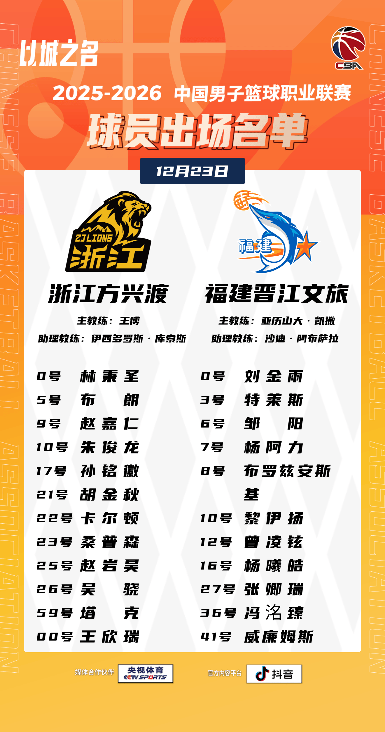 虎扑12月23日讯今日CBA常规赛,广厦对阵福建的大名单已经公布。