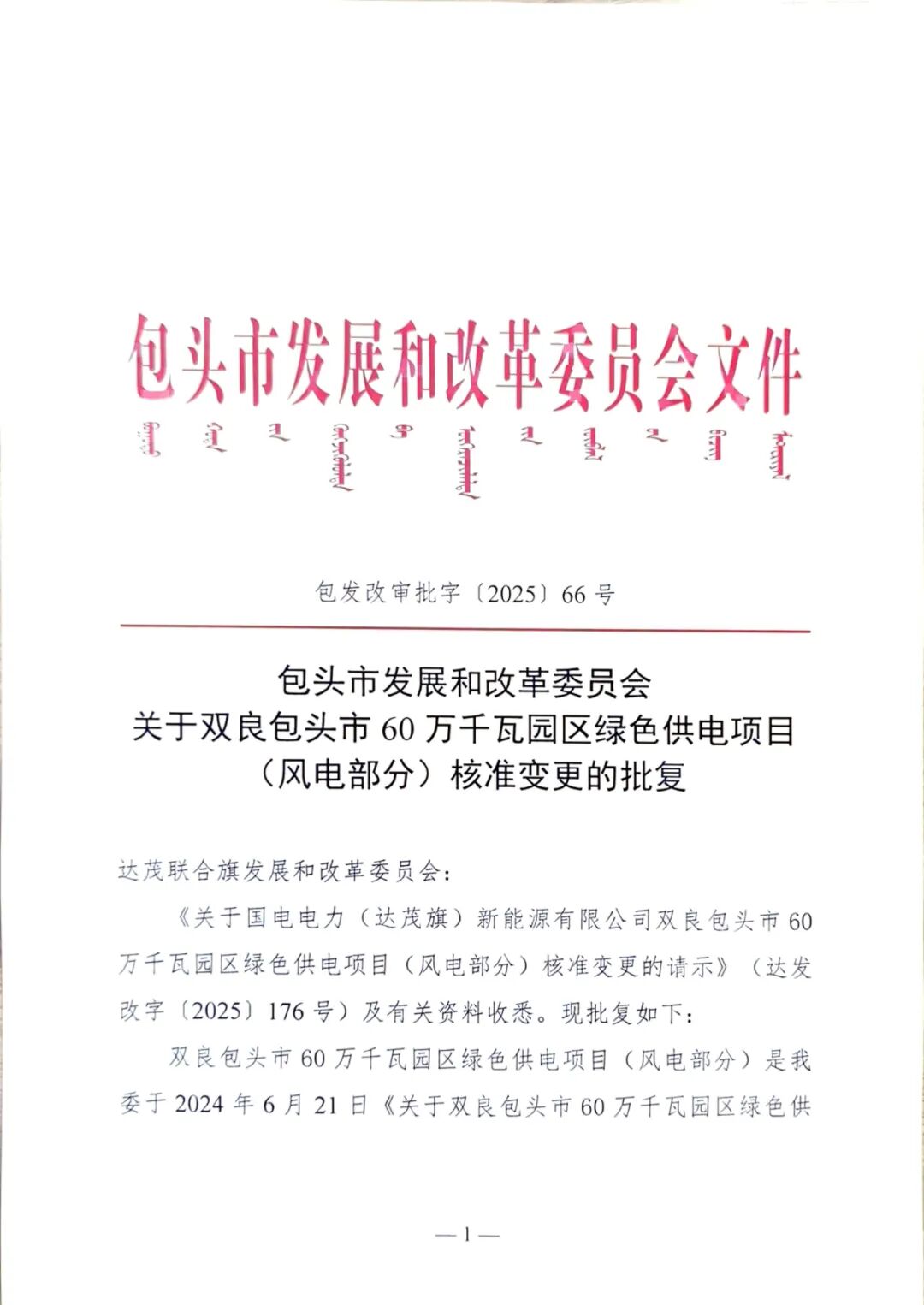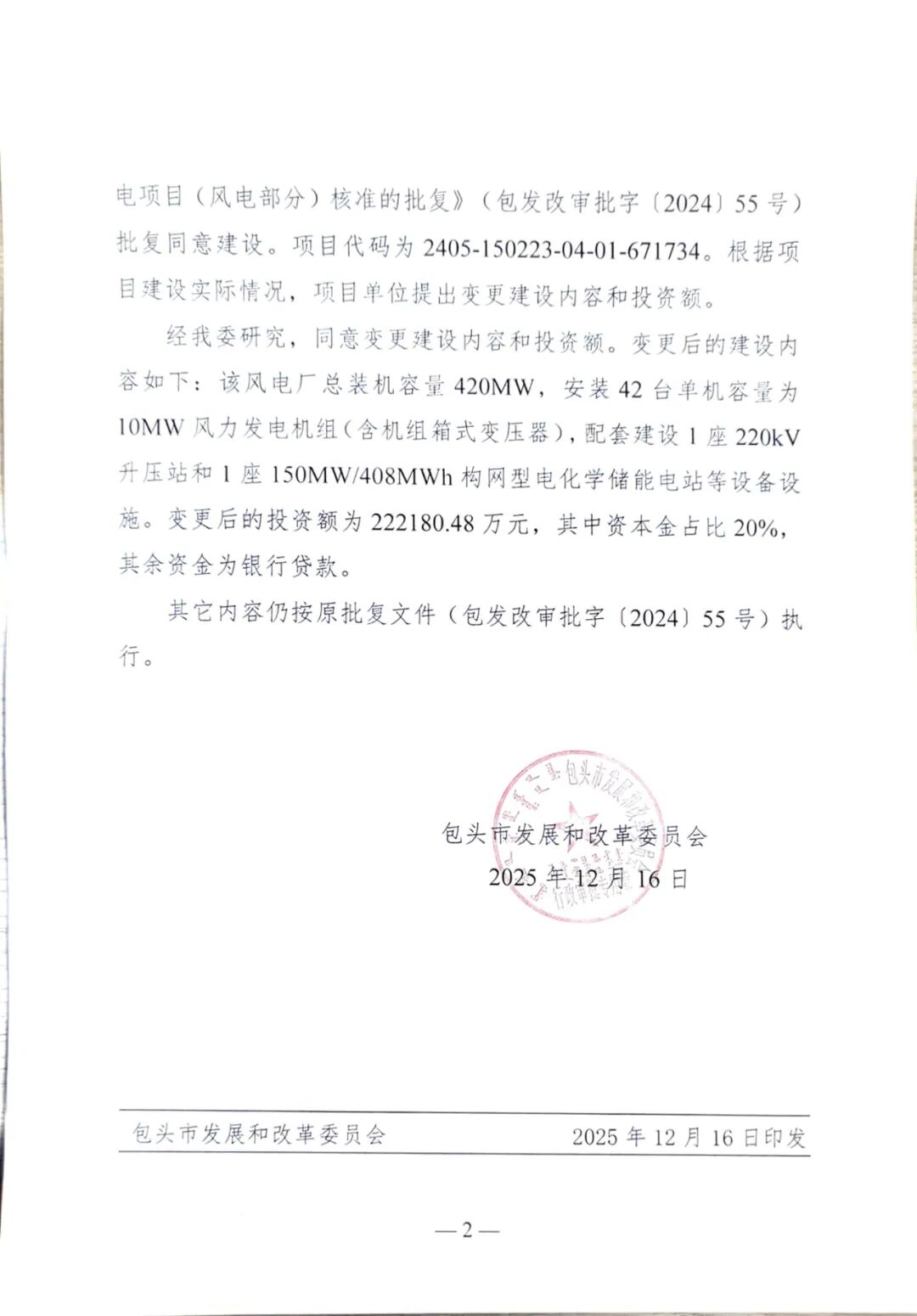 据悉,双良包头市60万千瓦园区绿色供电项目(风电部分)建设地点为包头市达茂旗,项目单位为国电电力(达茂旗)新能源有限公司。变更后的建设内容如下:该风电厂总装机容量420MW,安装42台单机容量为10MW风力发电机组(含机组箱式变压器),配套建设1座220kV升压站和1座150MW/408MWh构网型电化学储能电站等设备设施。变更后的投资额为222180.48万元,其中资本金占比20%,其余资金为银行贷款。