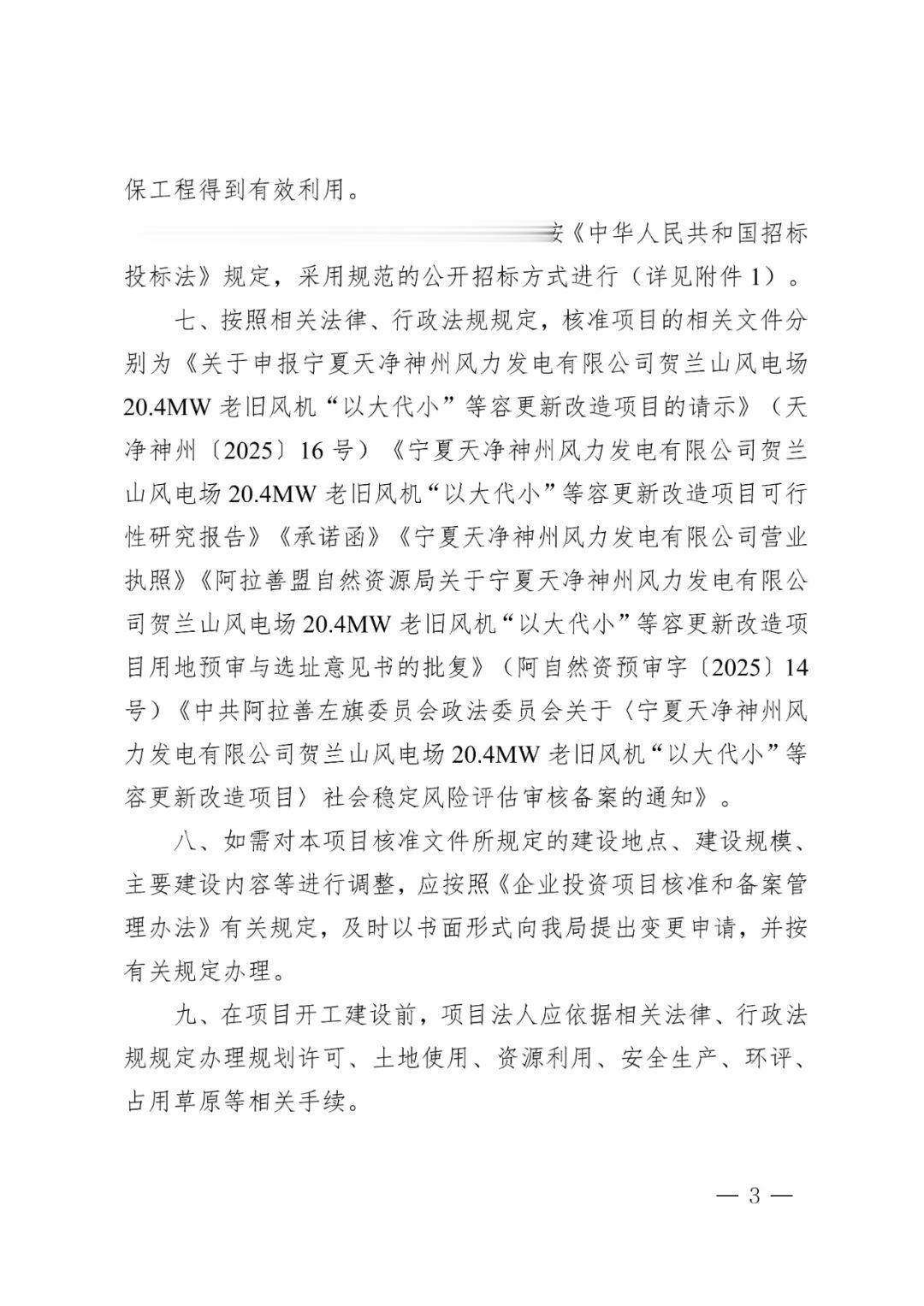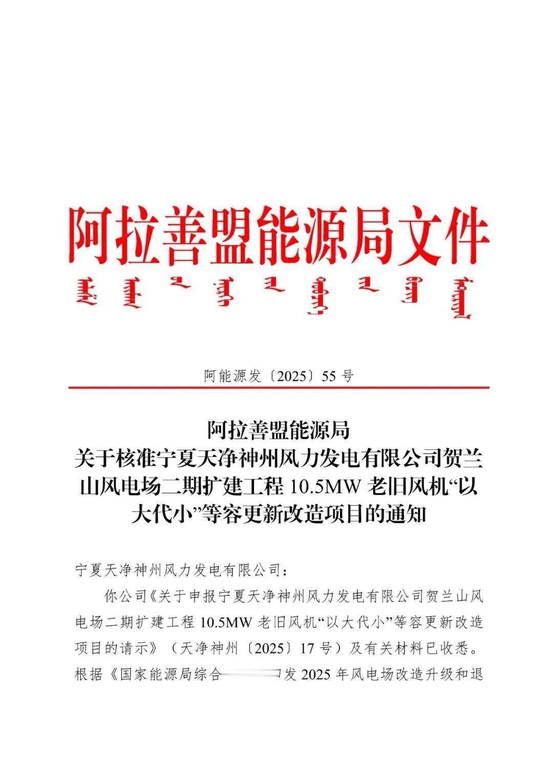 宁夏天净神州风力发电有限公司贺兰山风电场二期扩建工程10.5MW老旧风机“以大代小”等容更新改造项目位于内蒙古自治区阿拉善盟阿拉善左旗巴润别立镇境内,项目单位为宁夏天净神州风力发电有限公司,通过技术改造方式,对宁夏天净神州风力发电有限公司贺兰山风电场二期扩建工程10.5MW项目7台1500kW老旧风机进行等容改造。项目改造容量10.5MW,拆除现有7台1500kW老旧风机,等容量新建2台单机容量5MW的风力发电机组,配套建设箱变、检修道路等辅助设施,对原有10kV集电线路进行改造后接入现有110kV升压站。项目总投资为4418万元。