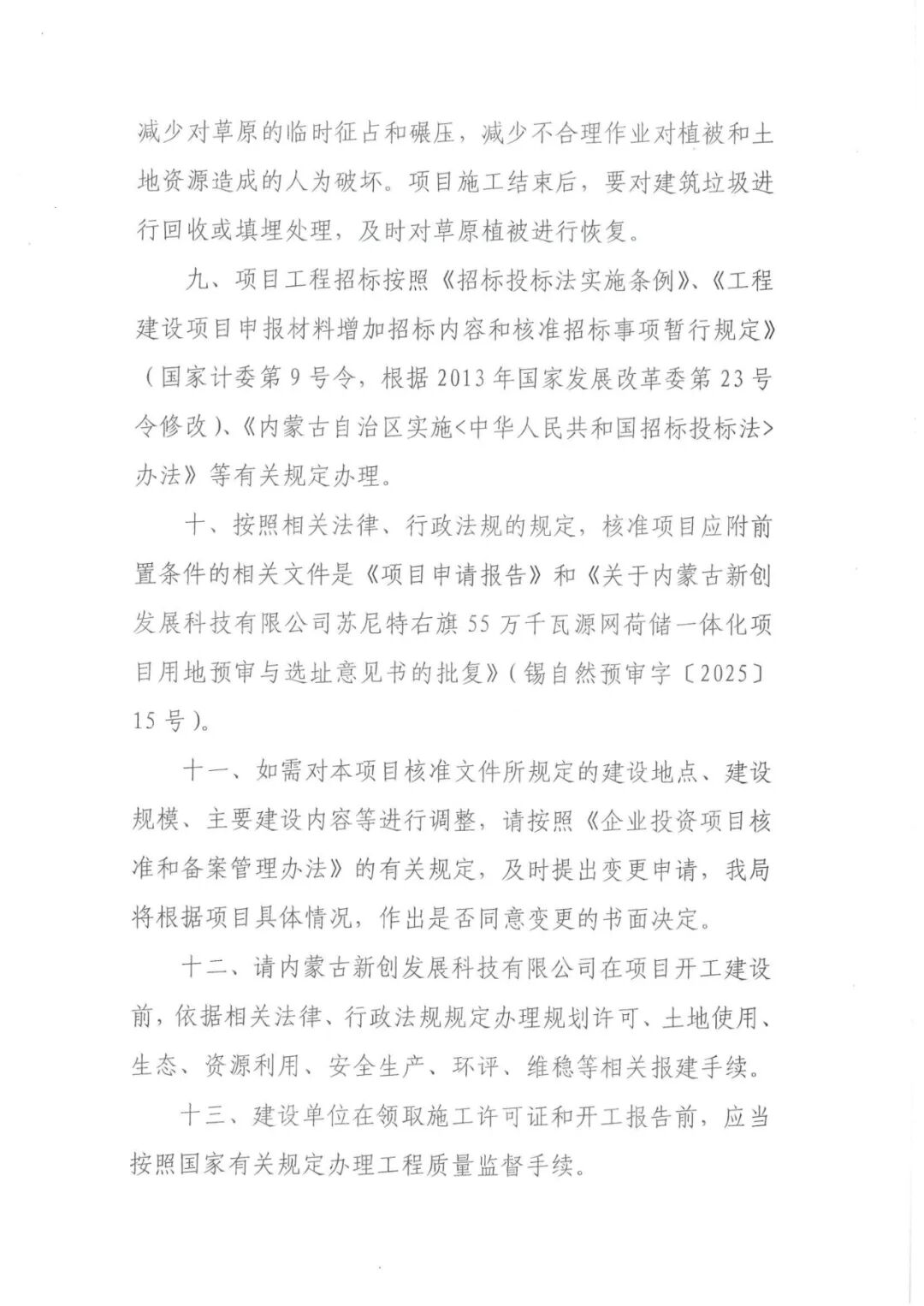 内蒙古新创发展科技有限公司苏尼特右旗55万千瓦源网荷储一体化项目(500MW风力发电部分)位于内蒙古自治区锡林郭勒盟苏尼特右旗赛汉塔拉镇巴润宝拉格嘎查境内,项目投资主体为新创智汇能源科技(内蒙古)有限公司,风电项目建设规模为500MW,拟选用单机容量10MW风力发电机组50台,配套数量箱变,集电线路、场内外道路及检修道路等,新建1座220kV升压站,并在负荷场地新建一座220kV变电站。项目总投资为155215.06万元。