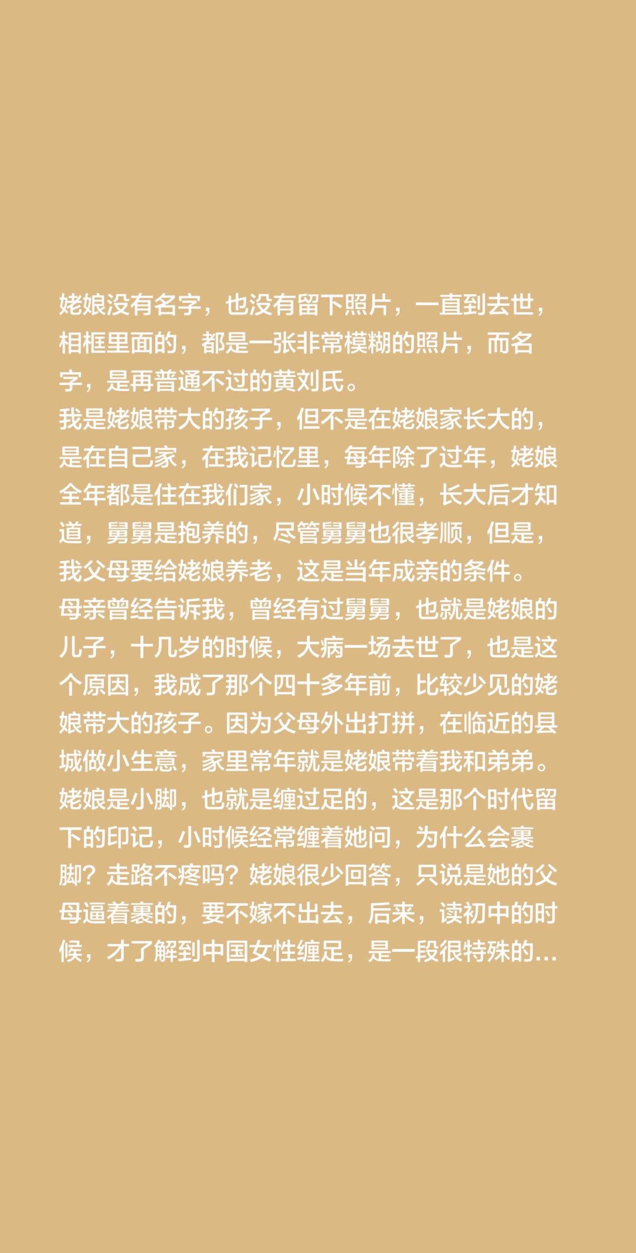 姥娘没有名字,也没有留下照片,一直到去世,相框里面的,都是一张非常模糊的照片,而名字,是再普通不过的黄刘氏。 我是姥娘带大的孩子,但不是在姥娘家长大的,是在自己家,在我记忆里,每年除了过年,姥娘全年都是住在我们家,小时候不懂,长大后才知道,舅舅是抱养的,尽管舅舅也很孝顺,但是,我父母要给姥娘养老,这是当年成亲的条件。 母亲曾经告诉我,曾经有过舅舅,也就是姥娘的儿子,十几岁的时候,大病一场去世了,也是这个原因,我成了那个四十多年前,比较少见的姥娘带大的孩子。因为父母外出打拼,在临近的县城做小生意,家里常年就是姥娘带着我和弟弟。 姥娘是小脚,也就是缠过足的,这是那个时代留下的印记,小时候经常缠着她问,为什么会裹脚?走路不疼吗?姥娘很少回答,只说是她的父母逼着裹的,要不嫁不出去,后来,读初中的时候,才了解到中国女性缠足,是一段很特殊的历史,以及这段历史留下的痕迹。 初中开始离家,在镇上住校,每个星期回家一天,那时家里没有电话,更没有手机和微信,姥娘每周五下午,都会去村口等着,搬个小板凳,和村里的其他老太太一起。炖一锅我喜欢吃的土豆炖肉,或者茄子炖肉,周日回学校,会把我的换洗衣服叠好,再炒一大瓶肉丝咸菜。挪着她的小脚,送我到村口。路上基本都是不要饿着一类的那那几句话。 后来读高中,变成了半月回家一次,村口接送的节奏没有改变,变了的是走的更慢了,还有就是会偷偷塞给我一些钱,每次大概四五十块,是她自己卖鸡蛋,还有省吃俭用省下来的。 高三那年,弟弟开始读初中,他的老师是我初中同学,读的是中专,要来家里家访,其实就是找我玩,我也就赶着中秋节回了家,那时正在秋收,院子里全是没剥的玉米,姥娘坐在和小山一样高的玉米堆旁剥玉米,看见过突然跑回家,很吃惊,以为出了什么事情,知道是老师要来家访后,变得有点紧张和严肃,反复嘟囔着是先生(她们那一代人称老师为先生)要来家访。开始打扫卫生,洗了头,还换了干净的衣服,把后院的婶子叫过来,安排去买菜,问我做几个菜好,我笑着和她解释,不是什么先生,就是我同学来家里玩,最终在她的坚持下,婶子炒了六个菜,就我和同学两个人吃,她坐在门路晒着太阳,始终不肯上桌吃饭,直到同学走了,还在说,先生来家里可不是个小事情,后来,因为同学一直在照顾弟弟,再让同学来家里,他说还是算了,让姥娘弄的很紧张,坐立不安的感觉。 读大一的时候,姥娘回自己家过年,突然摔了一跤,身体倒还很好,但是人开始变的糊涂,在舅舅舅妈的坚持下,没有再回我家,因为在济南读书,离的也不远,每两三个月,我会去舅舅家看她一次,起初还好,再往后就越来越糊涂,见到我,先是哭,然后就是抱怨,说舅妈不给她饭吃,舅舅和舅妈很尴尬的笑,反驳她,说她每天三顿饭,一大碗稀饭,一个大包子,或者一大碗炝锅面,这肯定是事实,我也只能哄着她,每次离开,都会问我,我母亲什么时候接她走,可是尽管舅舅不是亲的,也是从小养大的,他们家在村里也是大家族,老娘糊涂了,怎么也不可能让妹妹和外甥接走,背上不孝顺的名声。 04年毕业的第一年,姥娘83,农村讲73和84是到坎,闯过去增寿10年,最终还是没闯过去。 姥娘走了以后的下午,我接到了表哥的电话,说是要等我们去商量一下葬礼的事情,他们本来是一个家族过继的,但毕竟我是亲外孙,母亲打来电话,让我不要闹,也不要发脾气,和我说姥娘是高寿,没有受苦,让我去了舅舅家,也不要和人家吵架。 我到了以后,跪在小小的骨灰盒前面,没说话,只是在流泪,舅舅拉我起来,我就呆坐在那里,坐了大概有一个小时,听着他们很多人在商量第二天的葬礼,埋在哪里,每家亲戚给多少钱,这些好像都和我没什么关系。 葬礼的最后是烧衣服,烧掉老人所有的衣服,目前哭的撕心裂肺,在她的棉衣里,舅舅翻出来一些钱,十块二十的都有,大概几百块钱吧,他们把我叫过去,把钱给了我,说应该是平常攒起来给我的,我终于忍不住,哇哇大哭,然后把钱和衣服一起烧了。 直到现在,我还是常常自责,当年我什么就没拍几张姥娘的照片,为什么就没问问姥娘叫什么名字。姥姥 外婆 社会百态 回忆 人生 @我是柚子