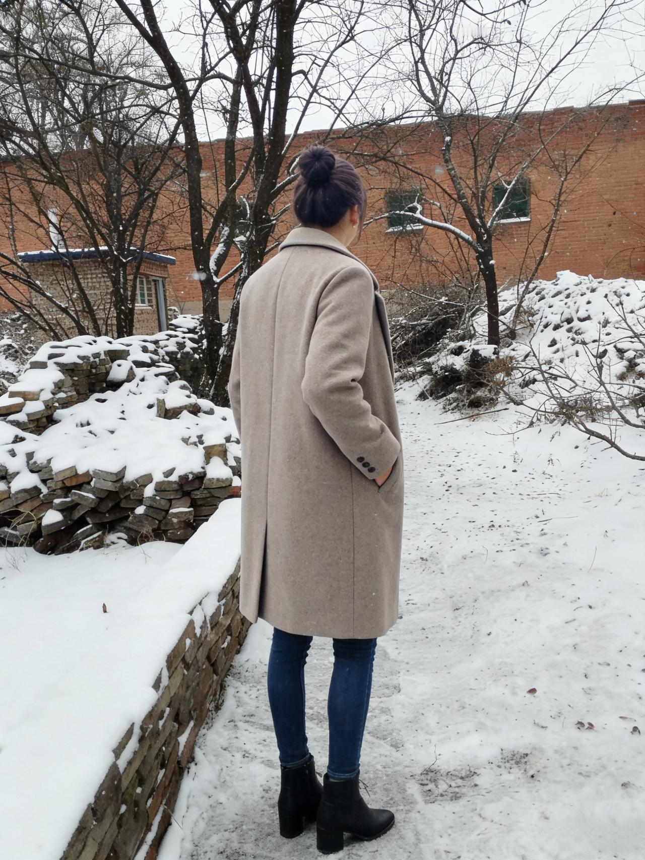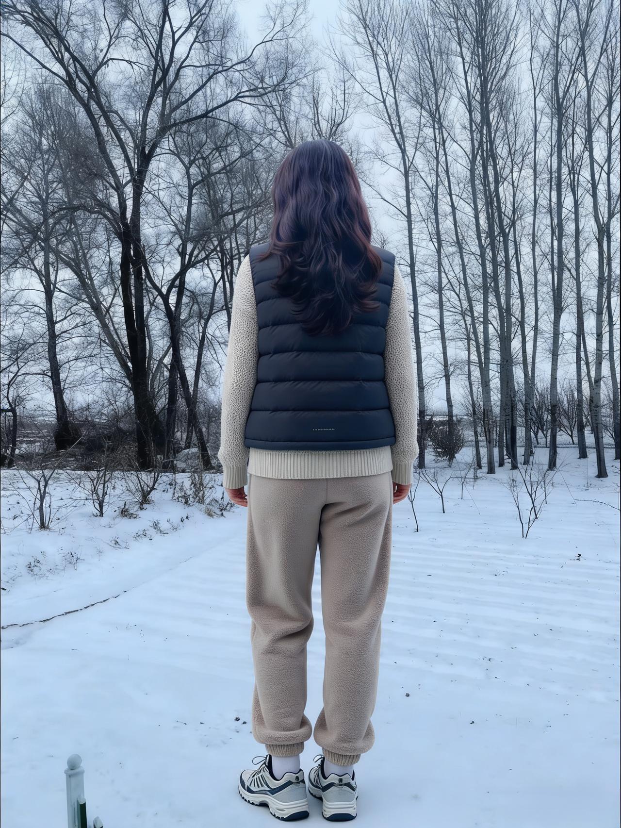 裘衣斜拥雪光寒,紫发轻扬落玉团。 独立荒园人不见,只留背影向霜峦。