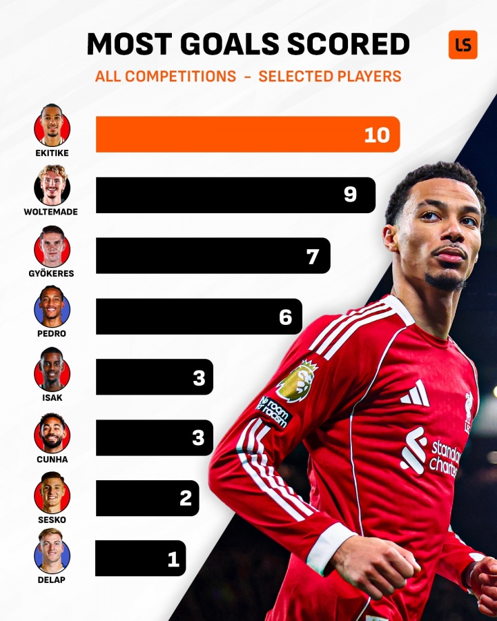 直播吧12月23日讯上周末英超第17轮比赛结束,英国媒体LiverScore列出了本赛季英超部分新援前锋的进球数,埃基蒂克打入10球排名第一。