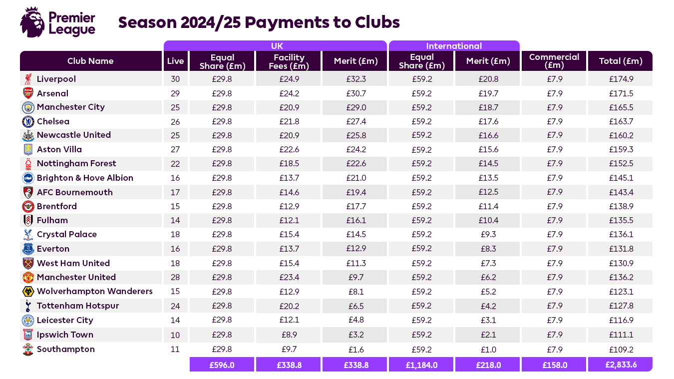 英超上赛季收入最高的俱乐部为利物浦(1.749亿英镑,约合2.0026亿欧元)。而英超排名垫底的南安普顿,其分红金额也达到1.2503亿欧元,这一数字超过了西甲第三名马德里竞技(1.0817亿欧元)约1700万欧元。