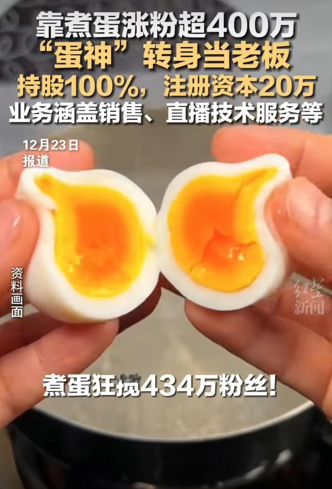 靠煮鸡蛋涨粉400万的蛋神开公司了。 我都怀疑他是不是早有预谋,一步步炒作起来的。要不然一个普通人靠着一个煮鸡蛋意外走红。 等热度过去,也就那样了。 但没想到这哥们又是媒体采访,又是上新闻,又是开公司,又是做直播。 一步一步都特别精准踩点,每段路程都好像有人在助推一样,每个节点都恰到好处。 现在互联网时代,普通人想红太难了。 这哥们如果没有公司包装,不是提前预谋的话,那么我只能说他也是个商业奇才。