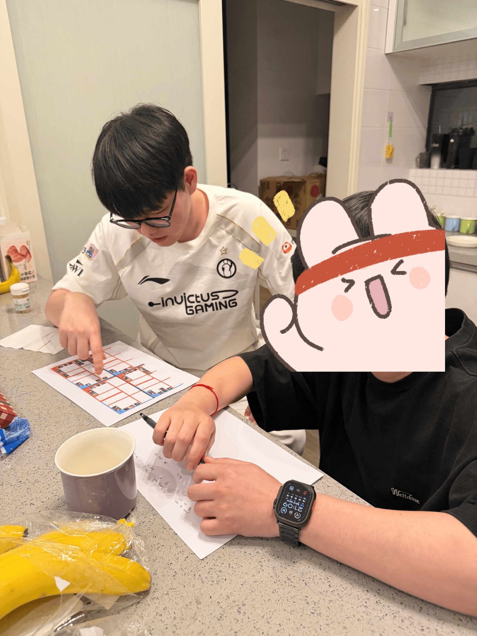 虽然阿姨当时已经做好饭了,但是并没有一个选手离开了训练室。菠萝包弟弟拿着纸笔叫上翻译老师找了张桌子坐下开始学习英雄的中文名称,开始赛后一对一中文补习班;小P也没有离开自己的位置,直接打开客户端继续进行排位训练;中野辅三个小脑袋围在一起开始自己的复盘讨论…