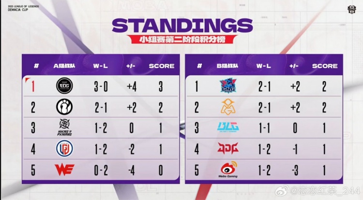 直播吧12月23日讯德玛西亚杯小组赛已进行了部分赛程,A组edg一骑绝尘、B组已达成闭环;