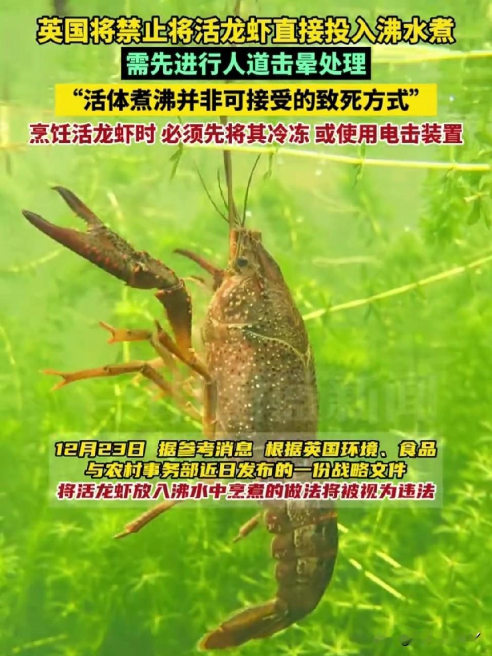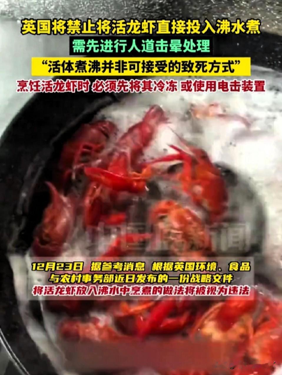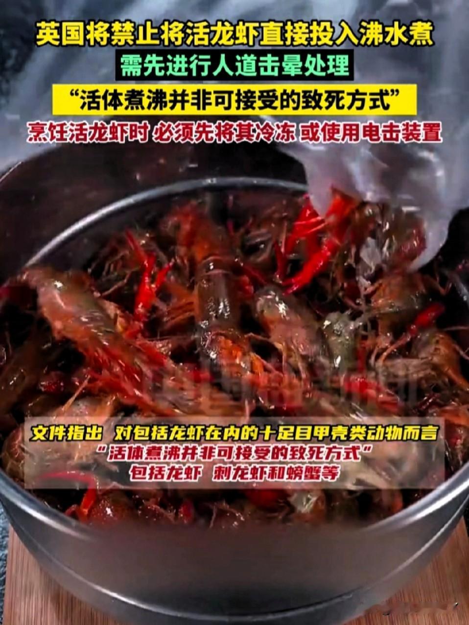 别觉得龙虾无痛感,科学都证实了它有痛觉神经,开水里那阵乱蹬,是实打实的煎熬。 咱们不能为了一口鲜,就对这种痛苦视而不见。 新规的核心是烹饪前先做人道处理,家庭里可以把龙虾放进冰箱冷冻层,低温冻到失去知觉;餐厅常用专业电机设备,在几秒内就让它失去意识,此后该煮该蒸皆可、随便。 有人说这是矫情,可对生命的尊重何来矫情之说?瑞士、挪威早就这么做了,也未影响品尝龙虾的美味。 其实,这事儿说到底,是咱们人类学着克制自己的欲望,对这些沉默的小生命多一份善意。 当我们愿意为一只龙虾多花些心思,这份对生命的敬畏,才是文明该有的模样。