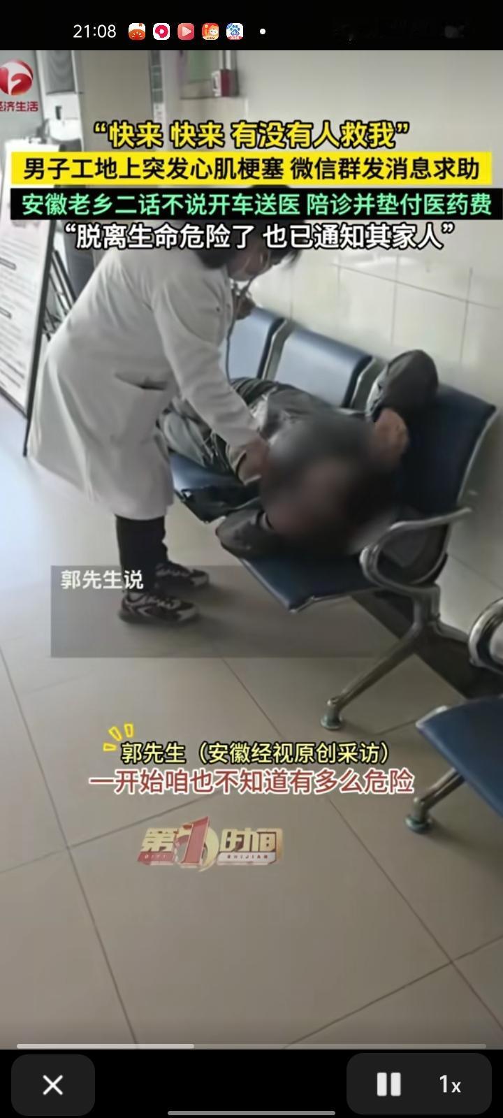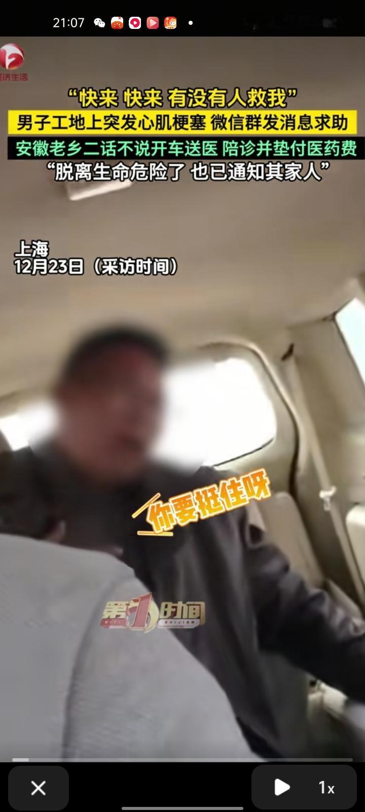 12月22日,上海。男子工地干活时突发心肌梗塞,在微信群发消息求助“快来快来,有没有人救我”,安徽老乡二话不说就开车送医。 当事人郭先生称,他来自安徽泗县,刚到上海不久,在工地开渣土车。看到信息后,想到是一条鲜活的生命,毫不犹豫就赶过去了。当时没拨打120等待,一是说不清工地所处位置,二是为争取时间,因抢救及时,工友无大碍。