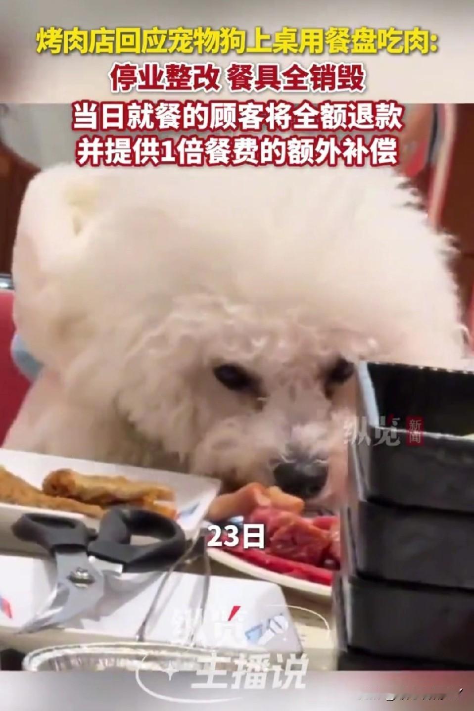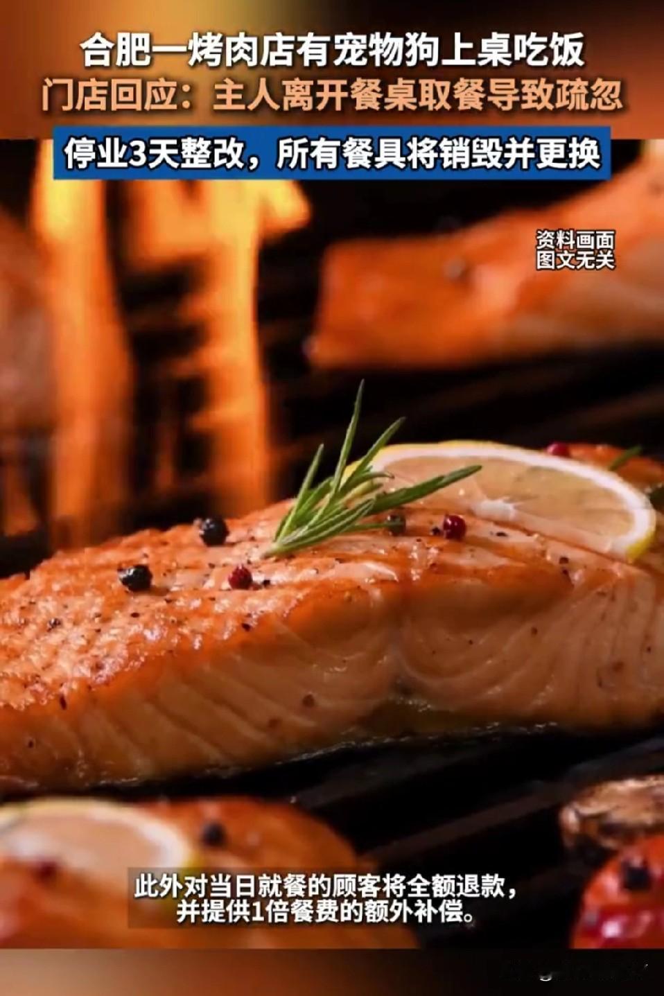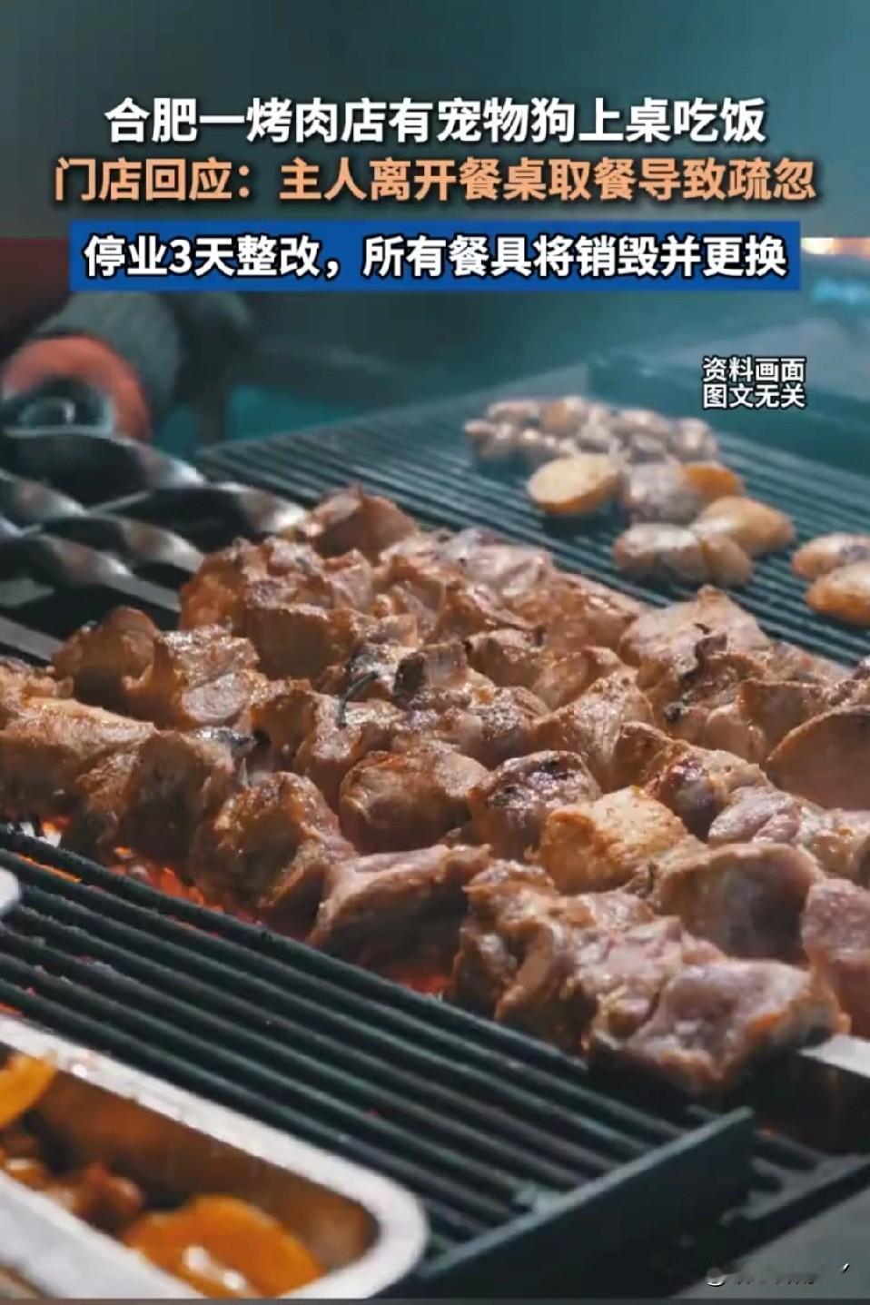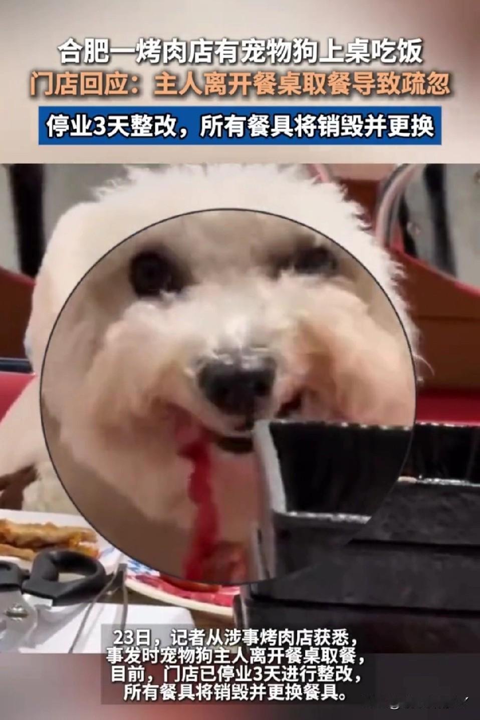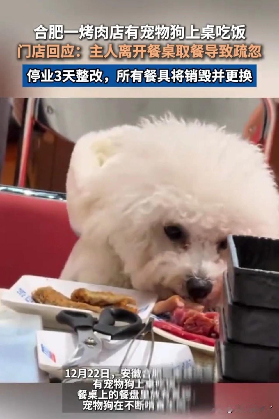 安徽合肥一家烤肉店,宠物狗上桌啃肉,导致店铺停业并全额退款,这事真不冤。 咱们爱狗本无可厚非,但公共用餐区属于大众,餐桌是供人就餐的地方,狗狗上桌不仅不卫生,也会让其他食客心里不舒服。 商家为了迁就个别顾客,却忽略了多数人的感受和健康,此举确实欠妥。 停业整改其实是一种提示:不管多么宠爱自家毛孩子,公共场合的规矩还是得守,这样既不辜负食客,也能让人与宠物和谐共处。 宠物狗