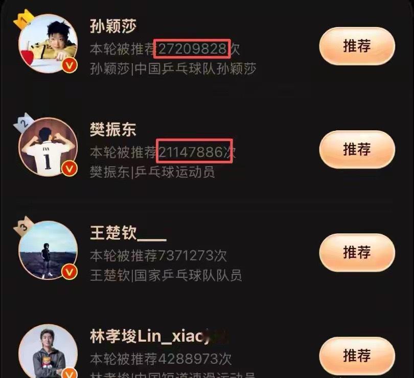 恭喜孙颖莎!即将斩获年度第2个大奖 超过2700万票 彻底甩开樊振东国乒在2025年的国际大赛已经全部结束,12月底还有国内的乒超总决赛,王楚钦和孙颖莎的伤情还没有更新,他们是否出战存在很大悬念。近期,国内某平台评选“年度能量人物”,孙颖莎加冕悬念不大!此前,《体坛周报》评选了年度各大奖项,孙颖莎荣膺“年度最佳女运动员”,如今斩获第2个年度大奖“年度能量人物”也只是时间上的问题,莎莎已经彻底拉开了差距,超过第2名的樊振东600万票!截止到目前,孙颖莎的总得票数已经超过2700万票,前几天还落后樊振东,这几日票数猛增,不仅来到第1名,而且彻底拉开了差距,断档领先。莎莎的人气真的很高,她对国乒的贡献大家也有目共睹,在WTT总决赛,即便受到伤病困扰,依旧带伤出战,这种精神也征服了所有人!樊振东排在第2位,大概率最终拿到“年度能量人物”的第2名,他也获得2100万票,甚至比第3的王楚钦高出1400万票,让人感到不可思议!小胖在2025年的表现也确实给力,他在全运会上完成男单卫冕,击败了王楚钦和林诗栋,依旧是最强的球员!毫无疑问,如果小胖选择回归国家队,他还是球队一哥,教练组也会给他留一个位置,等待他归来!王楚钦获得超过700万票,排在第3位,几乎不可能超越樊振东和孙颖莎了!王楚钦获得《体坛周报》评选的“年度最佳男运动员奖”,也是对他极大的肯定。在2025年,王楚钦最大的成就是夺得世乒赛男单金牌,这也是他在三大赛拿到的首个单打冠军,克服了心魔,不过王楚钦需要提升的空间还很大,统治力还不如巅峰时期的马龙和樊振东!王曼昱获得80万票,林高远也拿到50万票!处于半退役状态的陈梦,获得超过27万票,她在全运会带领山东队拿到女团金牌,而且还斩获女单铜牌,收获颇丰,一年多没怎么参加比赛,刚复出就能和顶级球员抗衡,陈梦确实很厉害,她其实被低估了。巅峰时期的陈梦攻防两端其实不输孙颖莎和王曼昱,只是她的状态不是很稳定,但连续两届奥运会,她都能发挥出最佳水准,真正的大场面球员!林诗栋获得1.9万票,梁靖崑获得1.3万票,他们的票数不是很多,影响力也确实没有那么大,不过林诗栋和梁靖崑都是国乒主力,实力是有的,需要更加稳定一些!