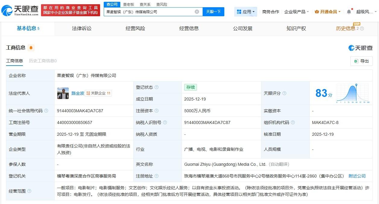 果麦文化在广东成立果麦智娱公司注册资本5000万 天眼查工商信息显示,近日,果麦智娱(广东)传媒有限公司成立,法定代表人为路金波,注册资本5000万人民币,经营范围包括电影制片、电影摄制服务、文化娱乐经纪人服务、以自有资金从事投资活动等。股东信息显示,该公司由果麦文化全资持股。 天眼查信息: