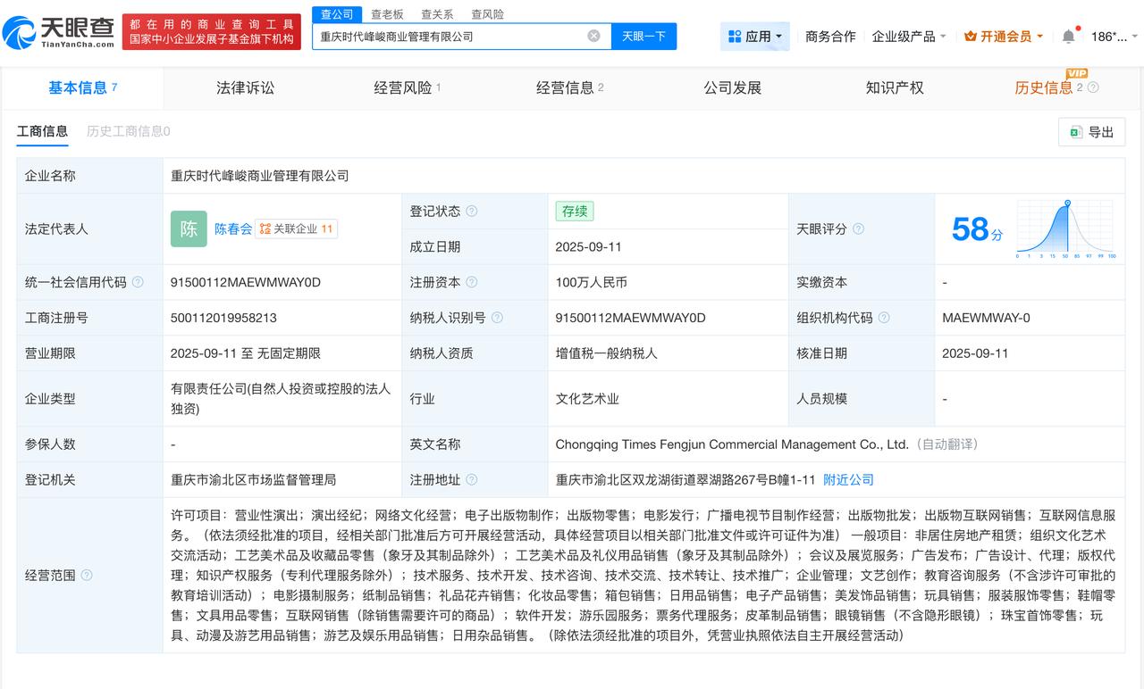 时代峰峻一公司经营异常 时代峰峻重庆新公司经营异常 天眼查经营风险信息显示,近日,重庆时代峰峻商业管理有限公司因通过登记的住所或者经营场所无法联系,被重庆市渝北区市场监督管理局列入经营异常名录。 该公司成立于2025年9月,法定代表人为陈春会,注册资本100万人民币,经营范围包括营业性演出、演出经纪、网络文化经营等,由北京时代峰峻文化艺术发展有限公司全资持股。 天眼查信息: