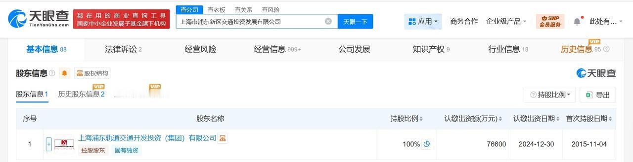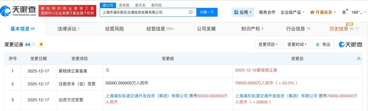 上海市浦东新区交通投资发展公司增资至7.66亿增幅约53% 天眼查App显示,近日,上海市浦东新区交通投资发展有限公司发生工商变更,注册资本由5亿人民币增至7.66亿人民币,增幅约53%。 该公司成立于1995年11月,法定代表人为诸正君,经营范围含投资管理、物业管理、软件开发、房地产开发经营、信息技术咨询服务、工程技术服务、发电技术服务、消防技术服务、数字技术服务等,由上海浦东轨道交通开发投资(集团)有限公司全资持股。 天眼查信息: