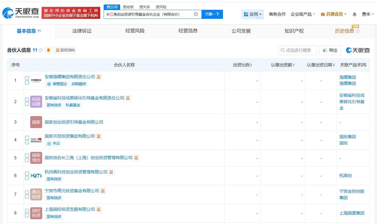 长三角创业投资引导基金登记成立出资额471亿 天眼查App显示,近日,长三角创业投资引导基金合伙企业(有限合伙)成立,执行事务合伙人为国投创合长三角(上海)创业投资管理有限公司,出资额471亿人民币,经营范围为以私募基金从事股权投资、投资管理、资产管理等活动,由安徽海螺集团有限责任公司、国家创业投资引导基金有限公司、国家开发投资集团有限公司等共同出资。 天眼查信息: