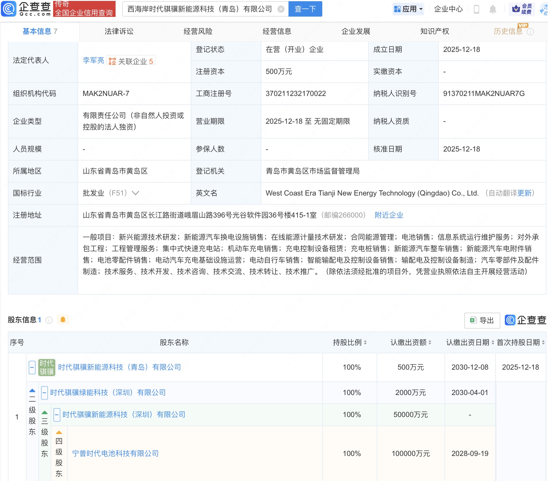 企查查APP显示,近日,西海岸时代骐骥新能源科技(青岛)有限公司成立,法定代表人为李军亮,经营范围包括新兴能源技术研发、新能源汽车换电设施销售、在线能源计量技术研发、新能源汽车整车销售等。企查查股权穿透显示,该公司由宁德时代(300750)旗下时代骐骥新能源科技(青岛)有限公司全资持股。