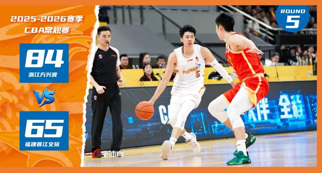 配文:今晚CBA常规赛第五轮继续进行,福建晋江文旅男篮客场挑战卫冕冠军浙江方兴渡男篮。两队前三节展开防守大战,比分始终未能彻底拉开,比赛来到末节,卫冕冠军的内线优势逐步体现,主队进攻端受限于对手严密防守,传导效率大幅下降,得分点愈发单一,只能依靠个别球员的零星发挥艰难追分,最终福建晋江文旅男篮以65-84客场不敌对手。四节比分分别是:13-13,20-24,16-22,16-25(福建晋江文旅男篮在前)。