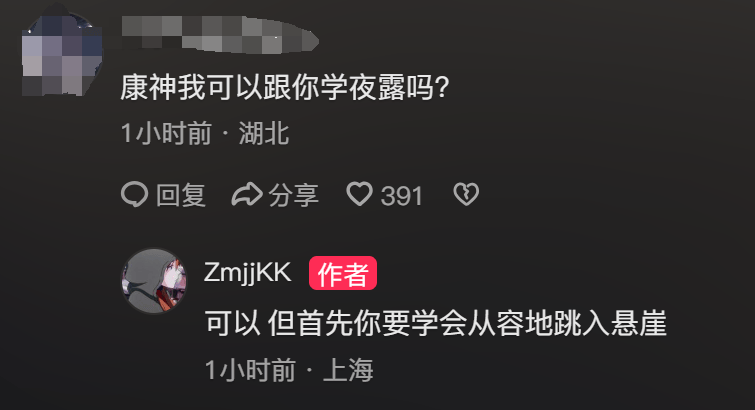 康康回复评论:可以跟我学夜露,但首先要学会从容跳入悬崖