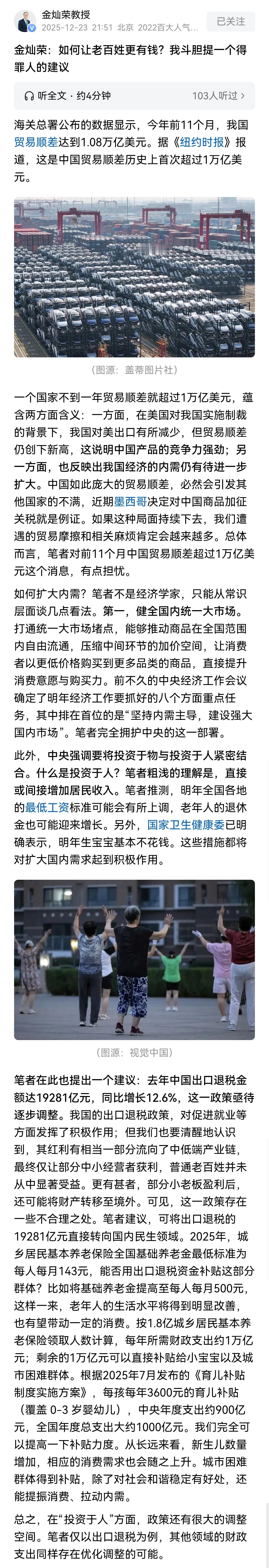 金灿荣:前11个月我国贸易顺差1.08万亿美元,我有一个担忧,有一个得罪人的建议。 前十一个月的对外贸易是在中美关税战的背景下进行的,1.08万亿美元的贸易顺差,在金灿荣看来有两个方面的含义:一是说明我们的产品在国际市场上极具竞争力,物美价廉,在一众亚洲欧美产品中脱颖而出。二是也说明我们的国内消费没有起来,我们的产品不得已大量出海。这自然也带来了两个方面的不利:一是带来了其他国家的不满,美国就是一个,它就一直认为我们赚了他们的钱,最近墨西哥也是,开始准备加征我们的关税。二是我们的产品价格便宜的代价,是我们拼命的压降成本,拼命的卷价格。这显然不是我们想要的结果。 所以金灿荣认为应该扩大国内的消费,强化投资于人,提高大家得工资水平,大家手里有钱了,少了后顾之忧,自然就愿意消费。他提出一个建议,就是把将近2万亿得出口退税额,加到城乡养老金和新生儿补贴里,老人是我看在消费的重要力量,新生儿是未来消费的希望。当前的出口退税并没有惠及太多数群体,如果采纳金灿荣的建议,用于提升大家的收入,自然产能刺激大家的消费了。