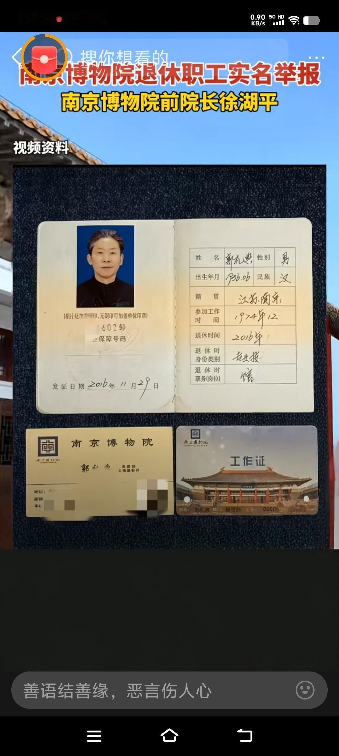 老员工手持身份证举报南博原馆长! 正在网友们为南博5件珍品去向担忧的时候,一位南博的老员工一段视频实名举报让人们感到为这些国宝级的珍品担忧,还能找回来吗? 南博老员工郭礼典1936年出生的91岁的老人手持身份证举报原馆长徐馆长倒卖文物! 郭老先生说,原馆长私自扯下文物封条,指使鉴定专家把文物鉴定为仿品,然后低价出售,出售价格为6800,后来又倒卖到上海,再后来又卖给法国人! 听到这里我心里真的发颤,卖给了外国人?如果郭老先生讲的是事实,我们的珍贵文物就外流了,追回来的难度会不会很大? 此联想到了圆明园的文物被八国联军抢到掠夺,焚烧毁掉罪证,国人永远不会忘记那段屈辱历史! 看着我们老祖宗留下来的凝聚着中华民族聪明才智的文化瑰宝,摆在国外的展馆中,作为中华儿女,炎黄子孙什么心情? 保护我们的古代文物,文化瑰宝,是一代又一代人义不容辞的责任,守住家业守护国宝每个百姓都该提高意识,有主人翁的责任感! 捐赠者把珍品捐赠给国家保管,是对博物馆多大的信任!他们认为让国家保管这是最有安全保障的地方,如果馆长监守自盗,将是千古罪人,这事必须彻查!