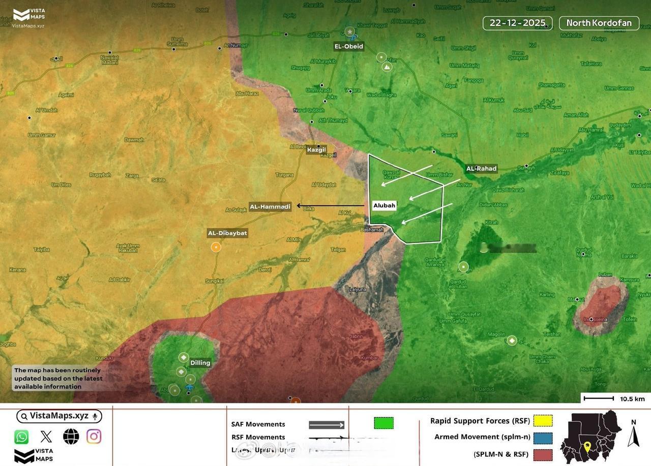 12月18日苏丹武装部队在尼罗河阿特巴拉机场的主要无人机基地遭到了快速支援部队无人机的打击。 包括一个掩体完全被毁,两个无人机机库受损。 这座位于机场主停机坪南部的无人驾驶飞机掩体旁边有几个集装箱,可能装有未组装的无人机零部件。 此前和之后的卫星图像显示了RSF无人机对苏丹阿特巴拉机场北部的影响。两个主要的加固掩体遭到破坏,其中可能有🇹🇷制造的Bayraktar无人机,而一个较小的机库则被完全摧毁。 北科尔多凡 苏丹武装部队拿下了阿鲁巴镇,而快速支援部队则向哈马迪镇和迪拜巴特镇撤退。
