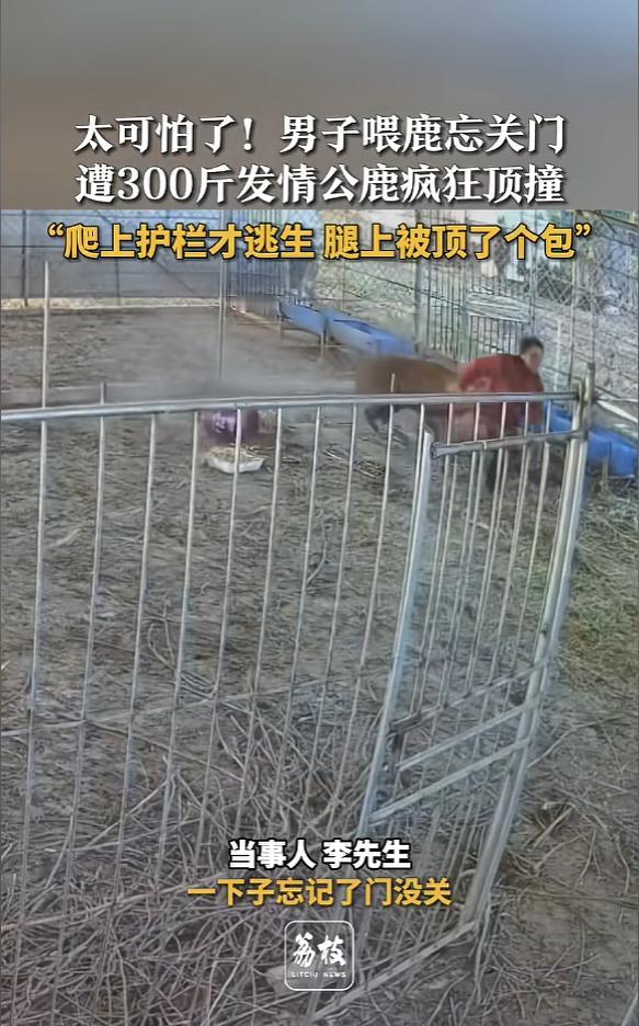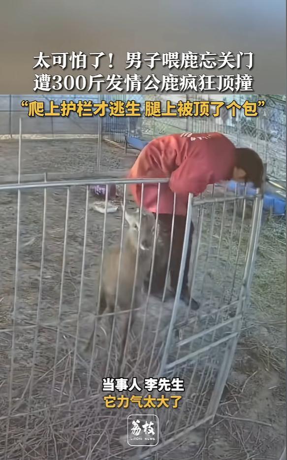 “太可怕了!”12月23日,江西吉安,一男子喂鹿时,因一时疏忽,忘记关闭铁门,竟被一头300斤重的公鹿猛烈攻击,吓得男子慌忙逃窜,随后拼尽全力,爬上护栏才暂时脱离险境,但腿上还是被顶了一个包!网友:还敢粗心吗?   这位遭遇攻击的男子姓李,是当地的梅花鹿养殖户。最近几年,梅花鹿养殖挺火热,药用价值带来的高昂经济回报,让不少人投身这个行业,却也容易让人忽略藏在温顺皮毛下的危险。   事发那天,李先生像往常一样进入养殖区投喂,这套流程他重复了千百遍,或许是太熟练,大脑产生了惯性麻痹,跨过铁门时,唯独忘了反手落锁这个关键动作。   对他来说,只是少做了一个动作,但在那头正处于发情期的公鹿眼里,敞开的大门、靠近母鹿群的陌生雄性气息,无异于赤裸裸的宣战。   谁都没想到,平日里看起来温吞的梅花鹿,发情期会变成被激素操控的“生物战车”。   那对造型优美的鹿角,此刻根本不是装饰品,而是带着穿透力的杀伤性武器。就在李先生毫不知情地走向母鹿群时,那头300斤的公鹿没有任何预警,直接低下头颅发起了全速冲锋。   事后李先生回想起来,还是心有余悸。那一瞬间的撞击力大得惊人,他根本来不及做出任何有效反抗。   本能的求生欲让他伸手去按顶过来的鹿角,可这举动跟螳臂当车没区别。被顶飞、踉跄着狂奔,这些动作几乎都是在大脑一片空白的状态下完成的。   万幸的是,肾上腺素飙升让他爆发出了全力,手脚并用地爬上了旁边的护栏,才算暂时躲开了鹿角的直接攻击,只是腿上还是被顶出了一个明显的大包。   更让人后背发凉的,是爬上护栏后的漫长对峙。那头暴怒的公鹿并没有转身离开,而是在护栏下方来回踱步,死死盯着上面的“入侵者”,眼神里满是原始的执着和敌意。   整整半个小时,李先生就那样挂在护栏上,不敢有丝毫松懈,只能硬着头皮跟这头失去理智的野兽比拼耐心。   直到其他鹿群涌入这片区域,嘈杂的声响分散了公鹿的注意力,它紧盯着李先生的目光才移开。李先生抓住这转瞬即逝的空档,才狼狈地从护栏上爬下来,逃出生天。   这起事件看着是意外,其实早有因果。很多养殖户觉得,人工养殖的动物已经被驯化,就慢慢放松了警惕。   可事实上,这种驯化顶多让动物少了些对人类的恐惧,根本没剔除它们基因里的野性和攻击本能。   尤其是繁殖季节,哪怕是一个没关严的铁门、一个稍微冒犯的动作,都可能成为引爆攻击的导火索。   不管是在养殖场还是野外,跟这些有力量的生灵打交道,每一次看似轻松的互动背后,都可能藏着安全隐患。   李先生这次遭遇里,那个被遗忘的铁门插销,成了最讽刺的注脚。跟动物相处时,任何侥幸心理都是在拿自己的性命赌博。   对养殖户来说,检查围栏牢不牢固、观察动物状态好不好,这些看似枯燥的流程,都是保命的底线。只有把这些细节做到位,才能在动物失控的瞬间,为自己留一道安全屏障。   李先生腿上的包迟早会消退,但那种在护栏上与暴怒公鹿对视半小时的恐惧,应该成为永久的警钟。   这也提醒所有从业者,千万别因为熟练就疏忽大意,任何一个微小的疏漏,都可能换来无法挽回的后果。
