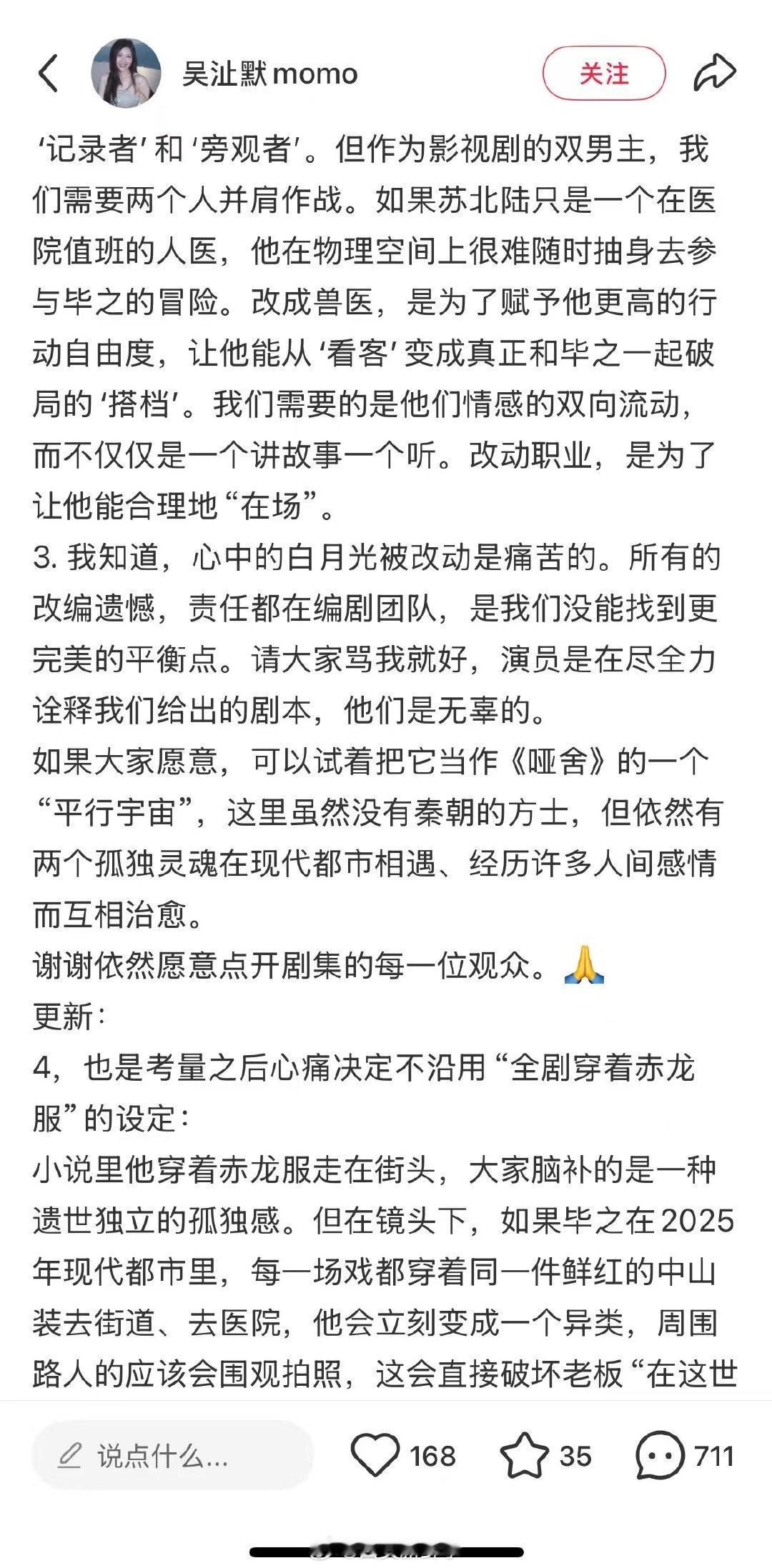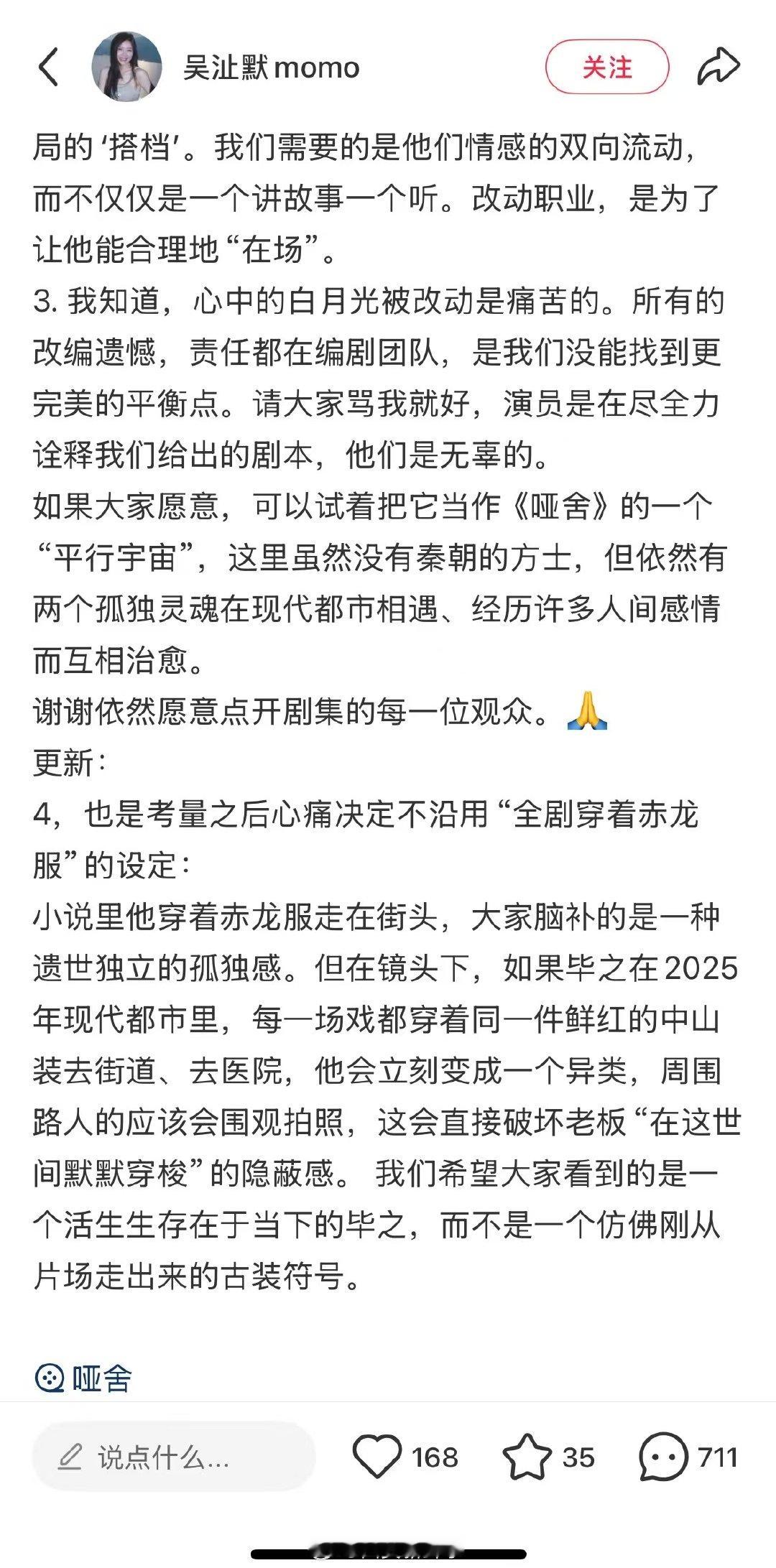 【哑舍编剧致歉】哑舍编剧称不求原谅但求沟通12月22日,《哑舍》编剧吴沚默发长文回应了网友们对这部剧的争议。她称,关于“魔改”的愤怒我都接收到了,之前的回复因为急于解释,可能有些词不达意,让大家更生气了,对不起。