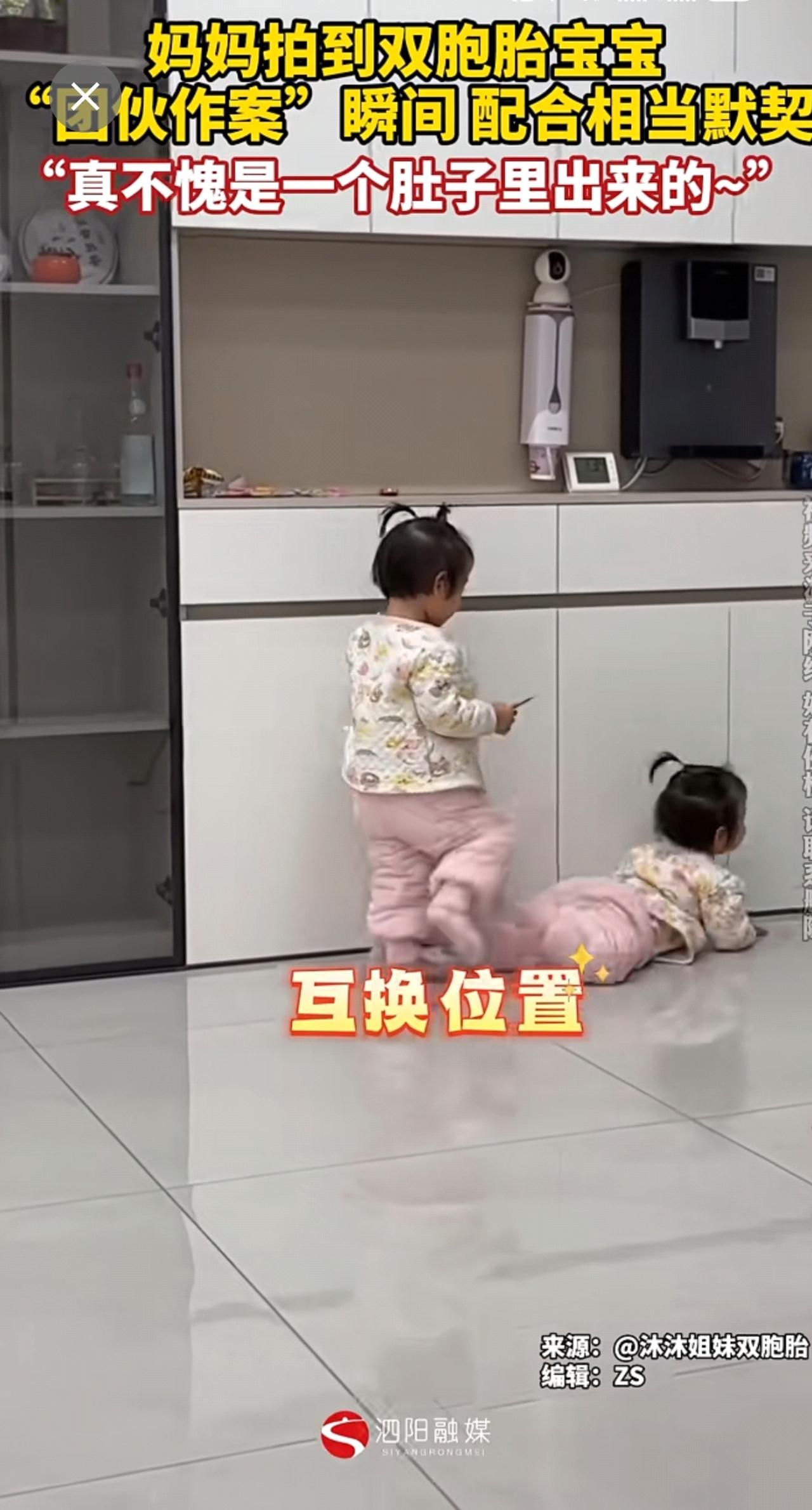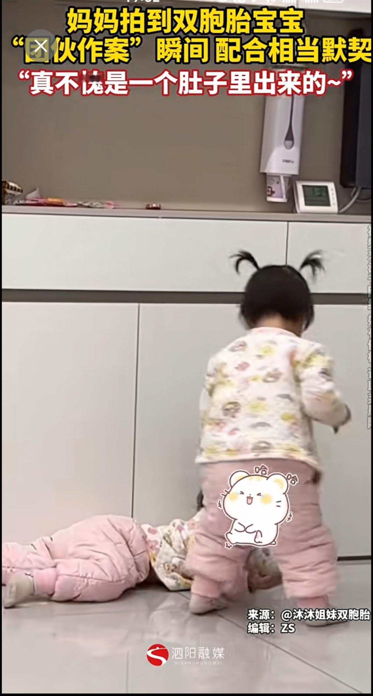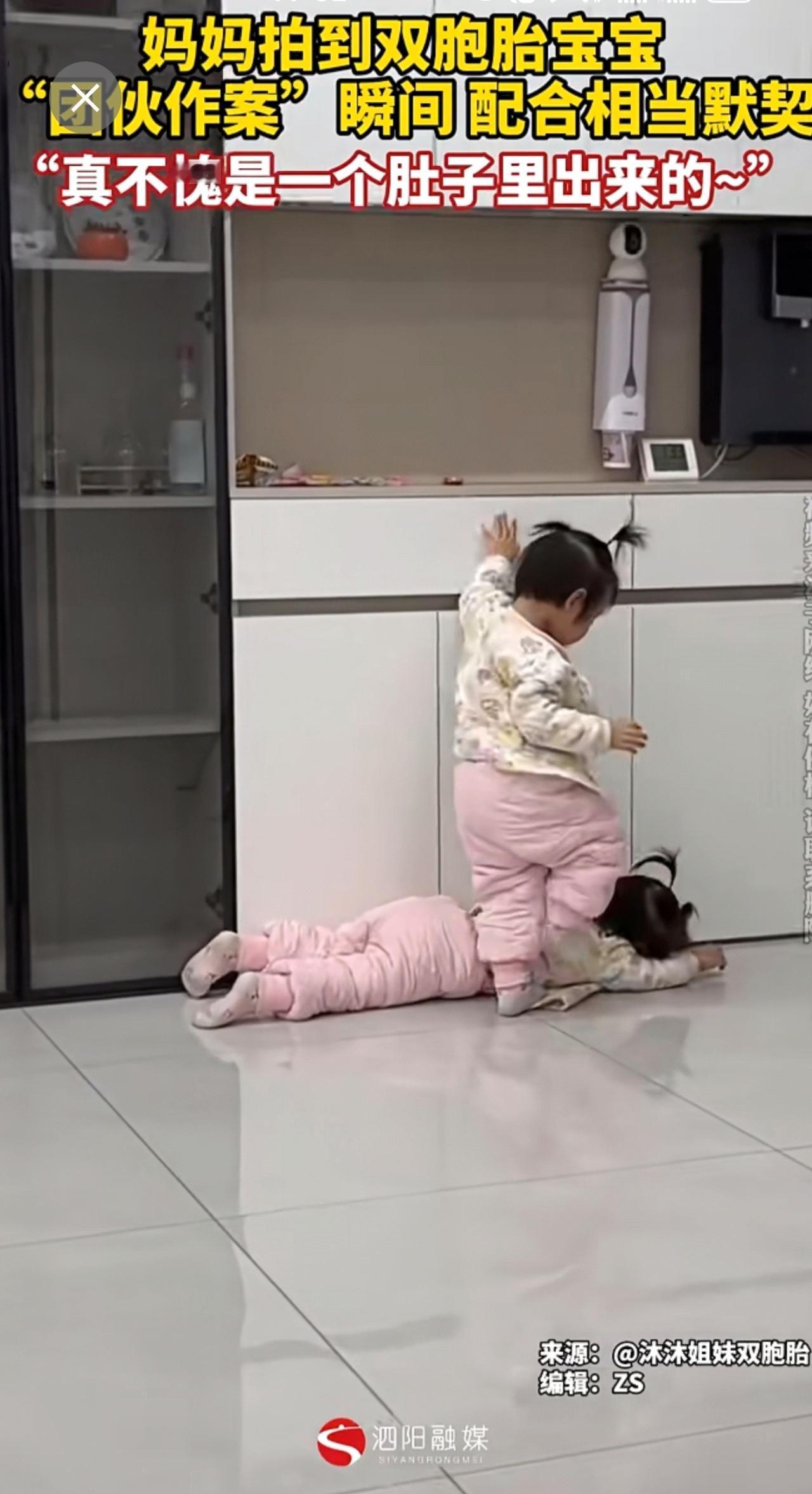妈妈拍到双胞胎宝宝“团伙作案”瞬间 配合相当默契 “真不愧是一个肚子里出来的~”(视频来源:沐沐姐妹双胞胎)原谅我不厚道的笑了 哈哈哈 神操作