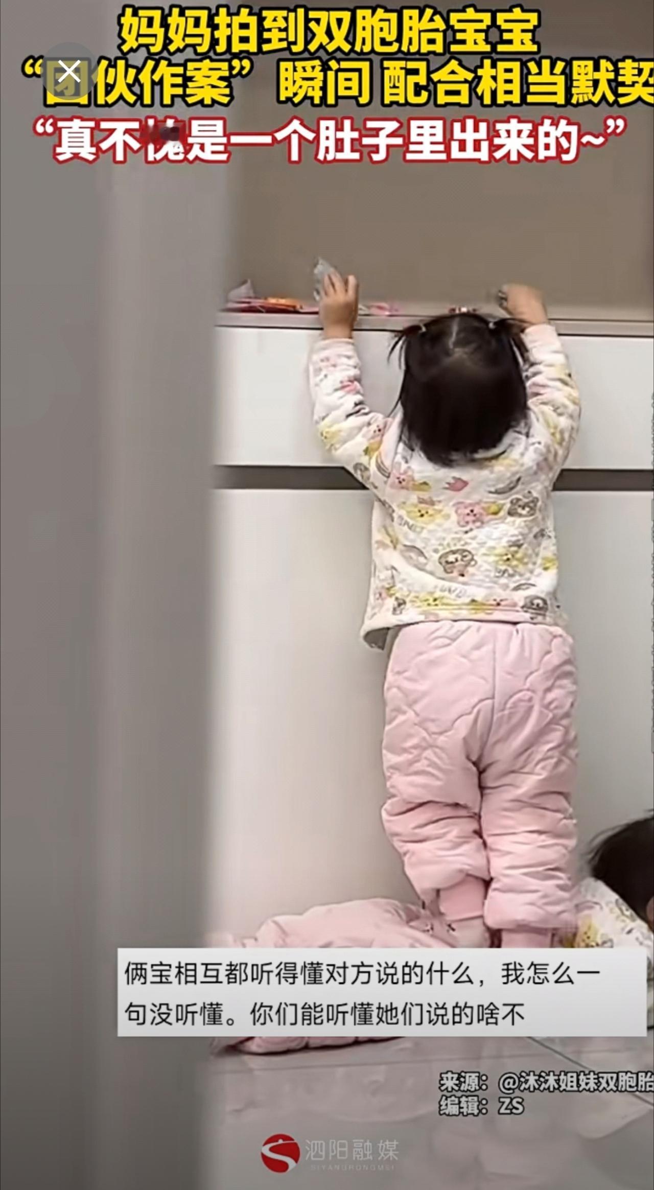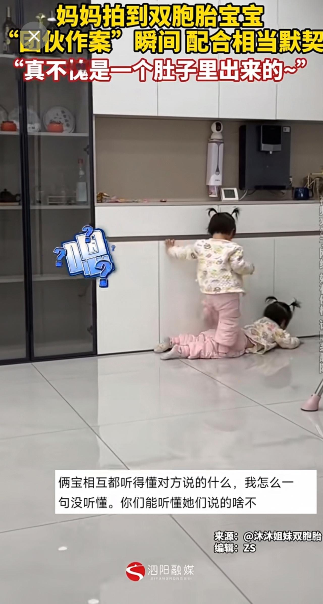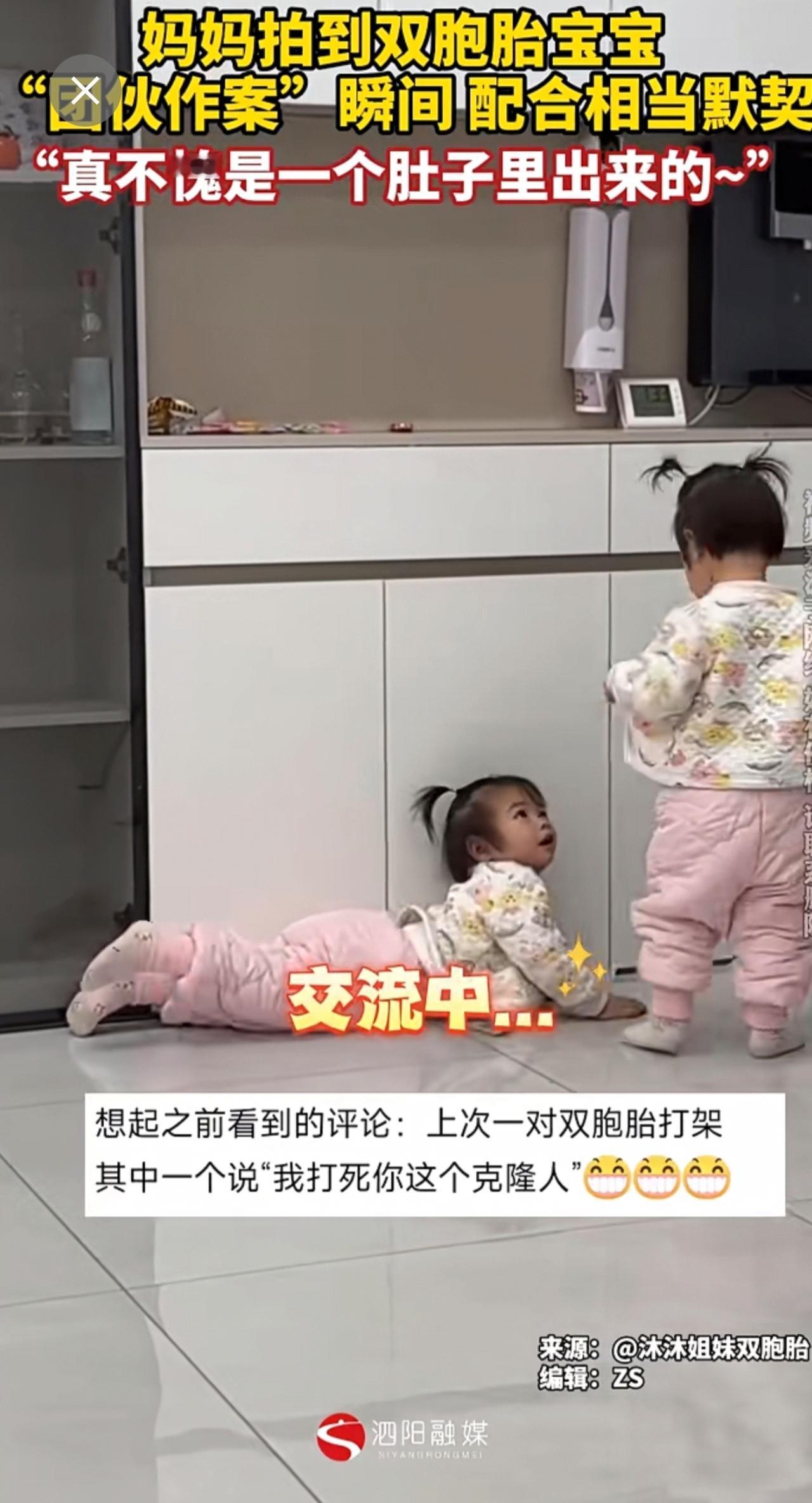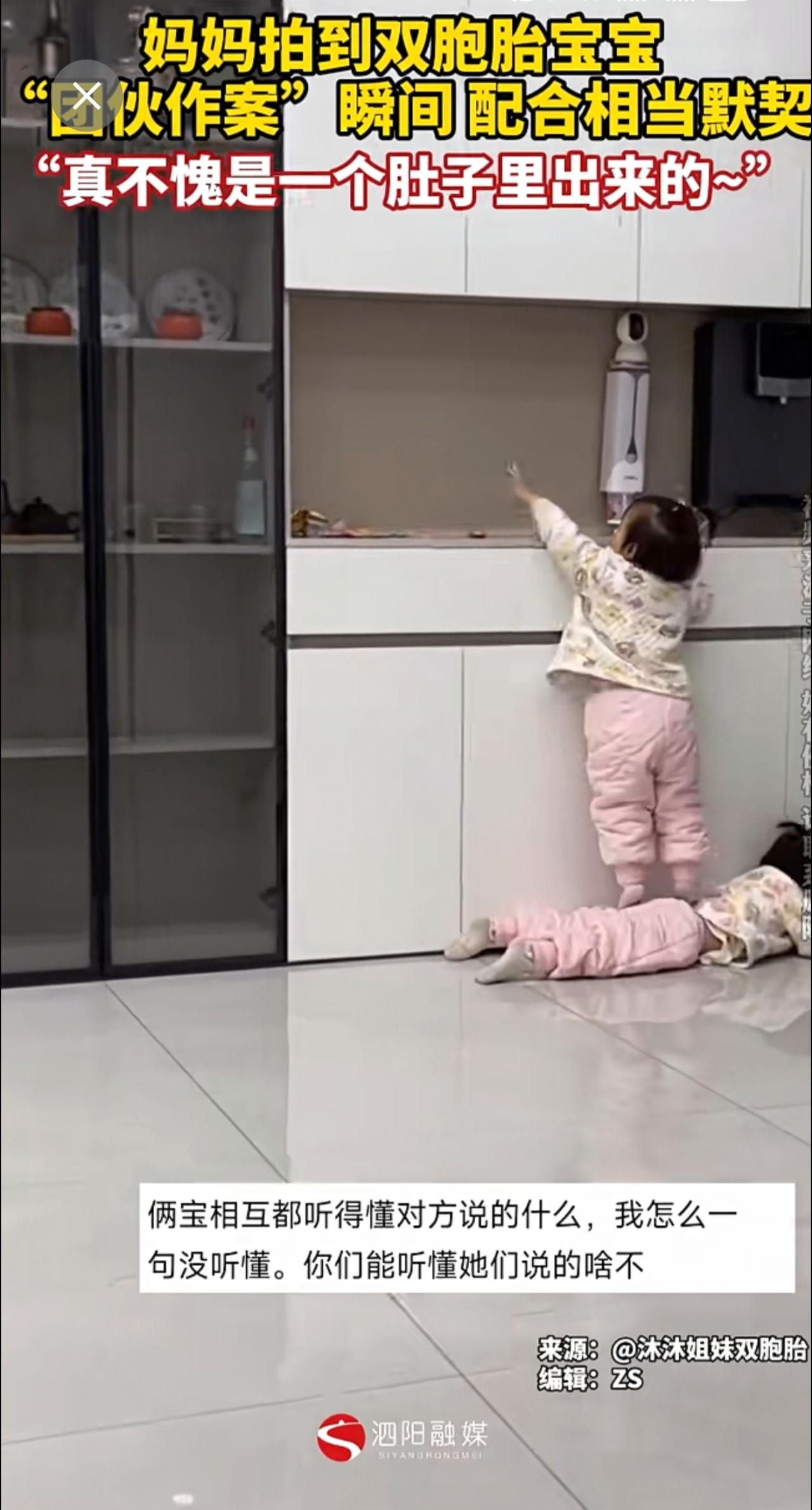 妈妈拍到双胞胎宝宝“团伙作案”瞬间 配合相当默契 “真不愧是一个肚子里出来的~”(视频来源:沐沐姐妹双胞胎)原谅我不厚道的笑了 哈哈哈 神操作