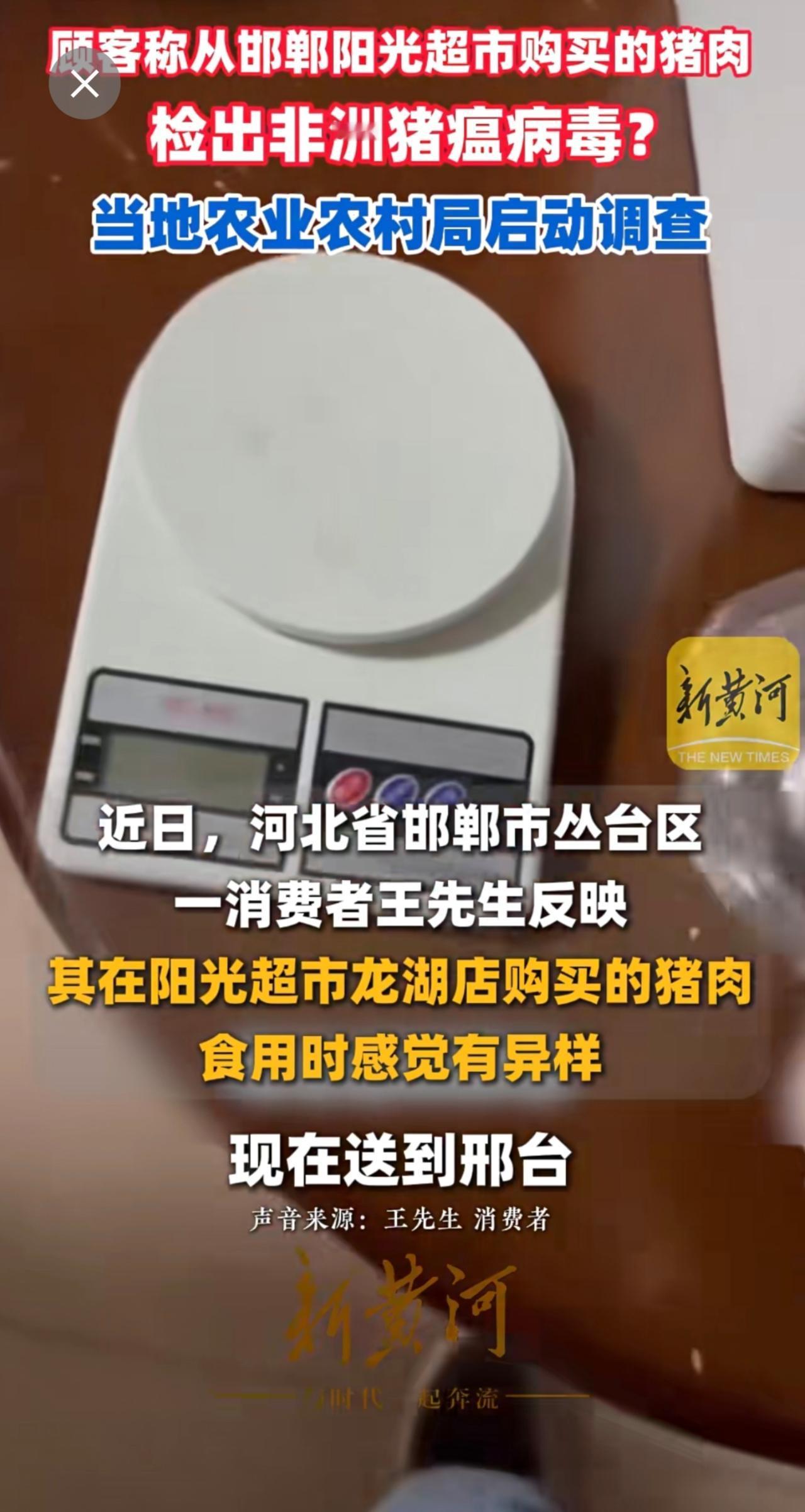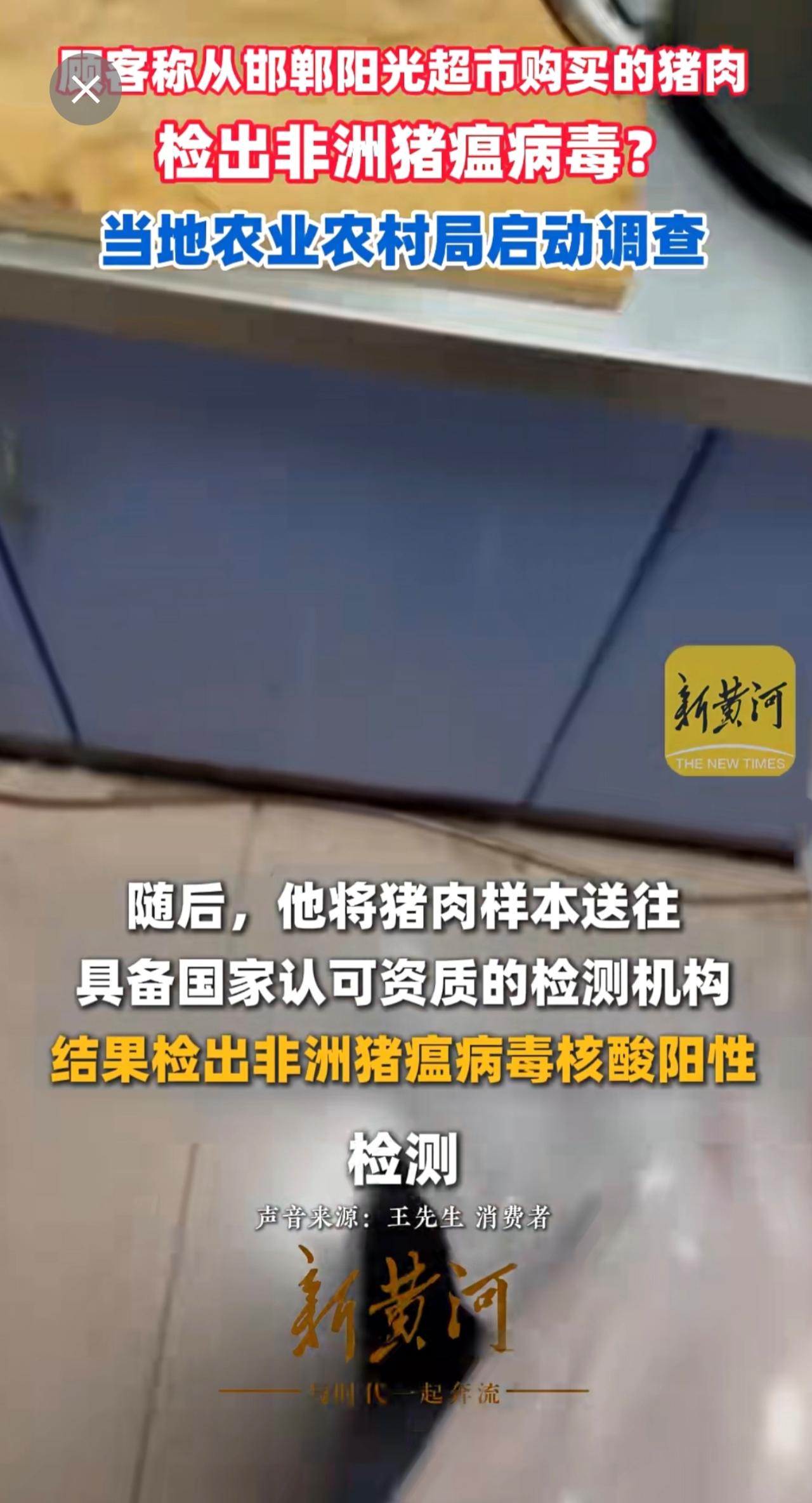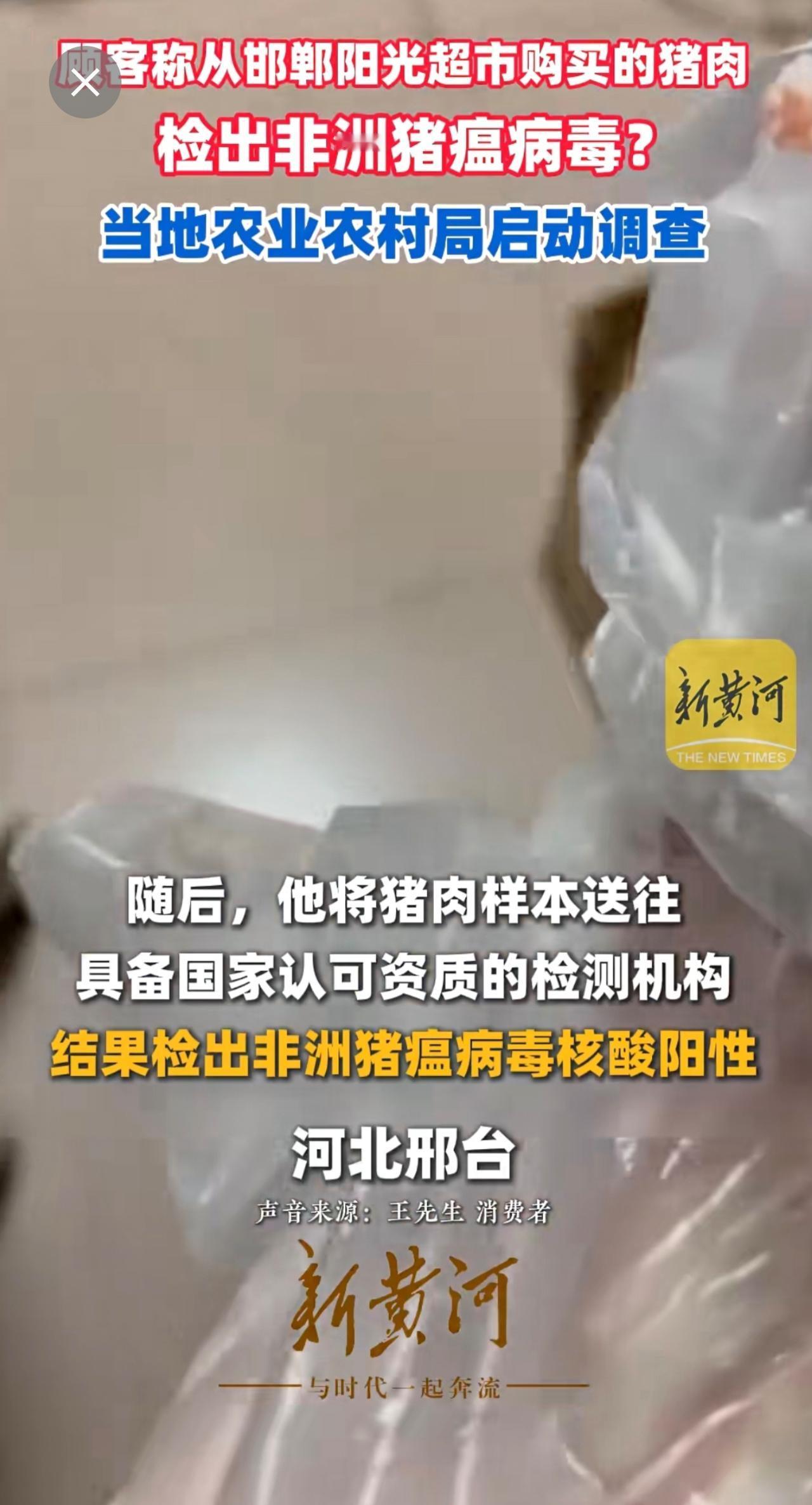 顾客称从邯郸阳光超市购买的猪肉检出非洲猪瘟病毒?当地农业农村局启动调查(记者:刘