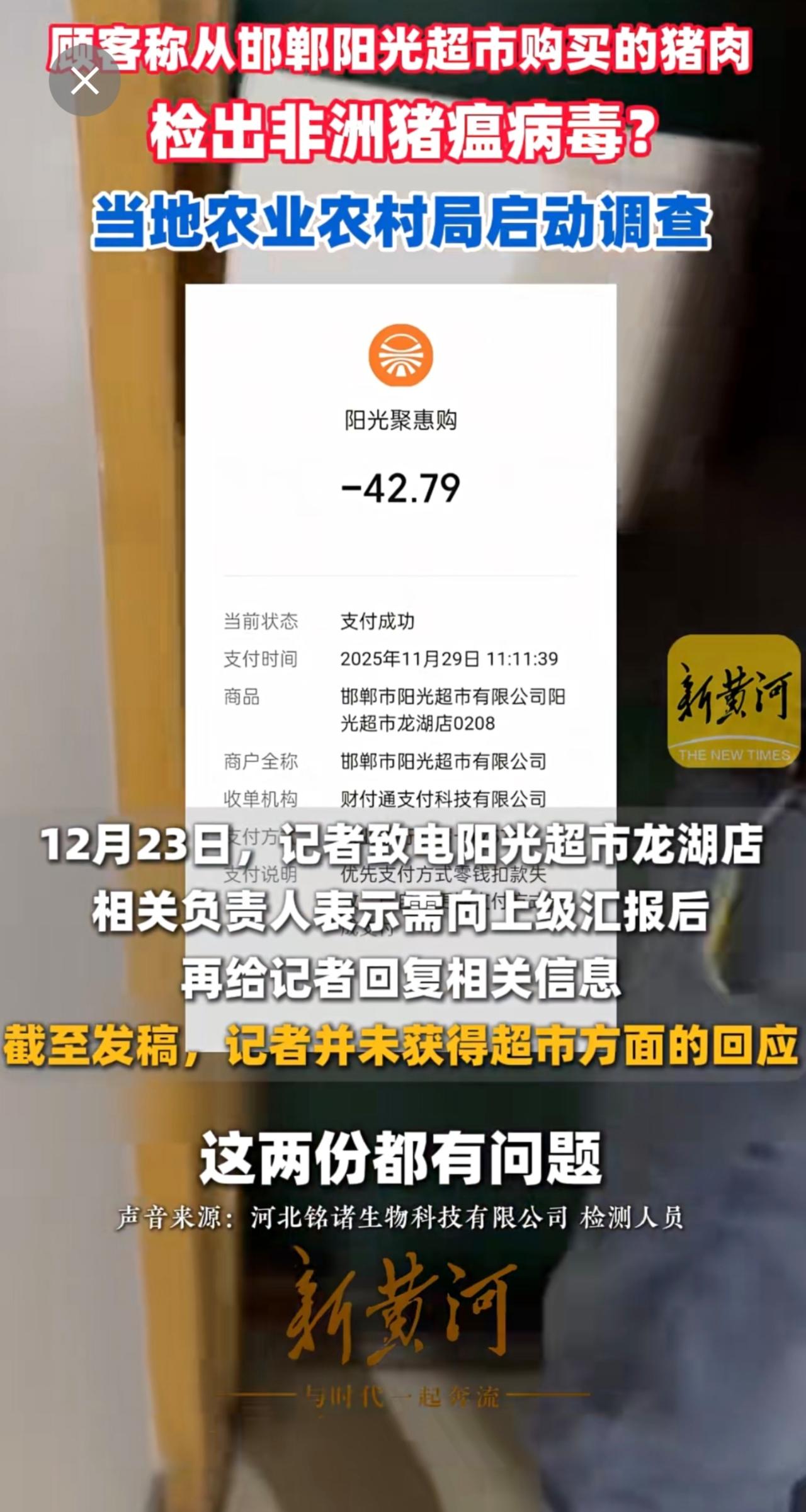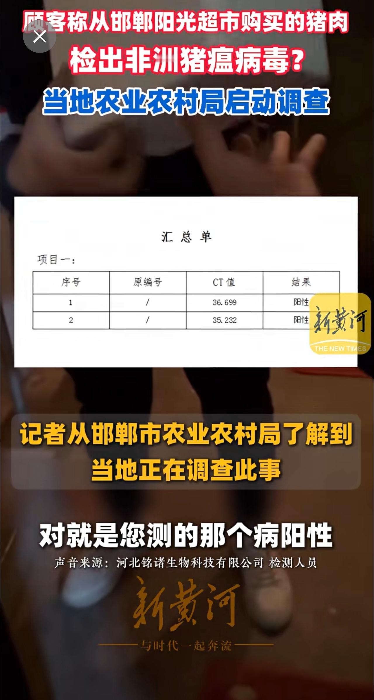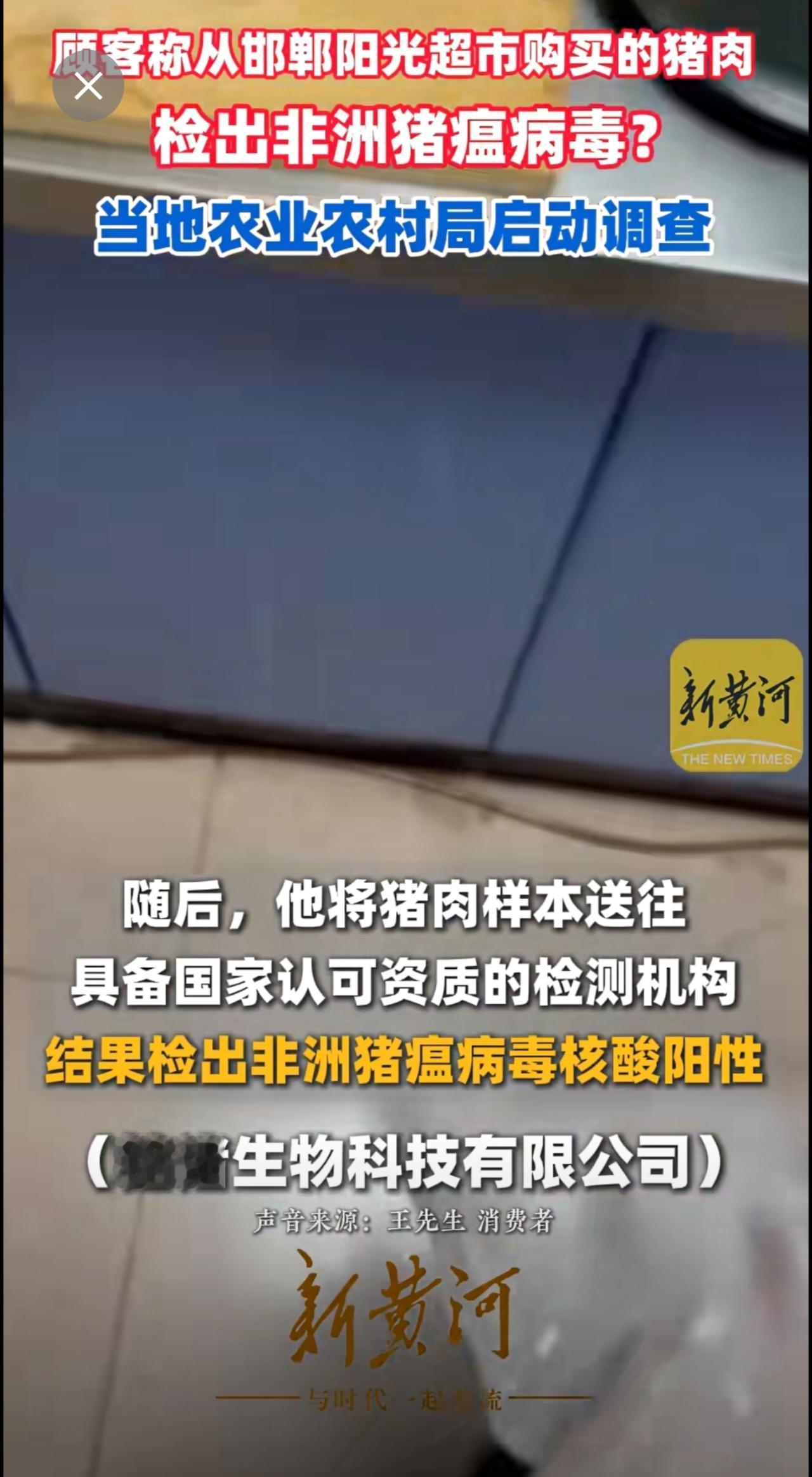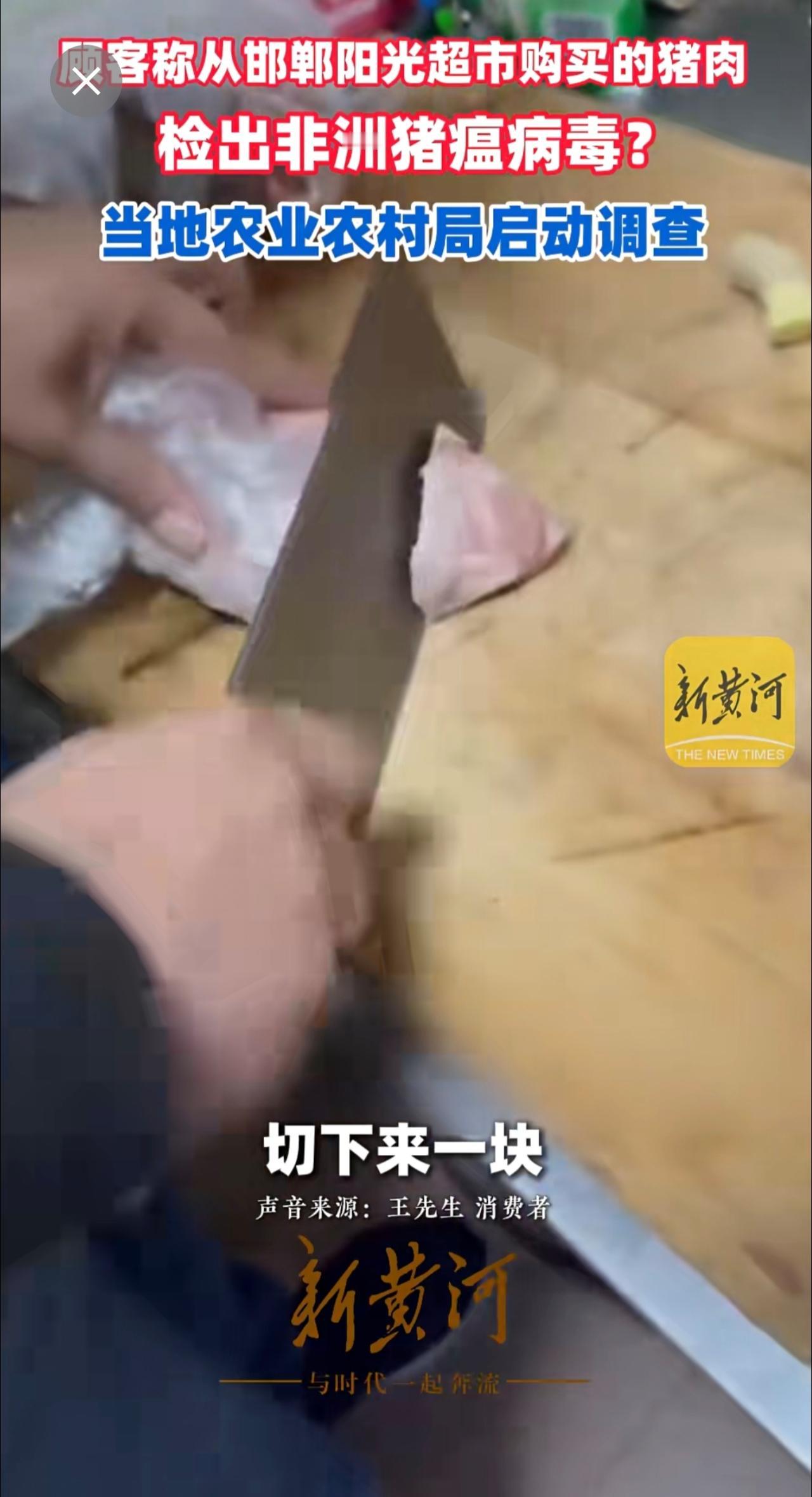 顾客称从邯郸阳光超市购买的猪肉检出非洲猪瘟病毒?当地农业农村局启动调查(记者:刘