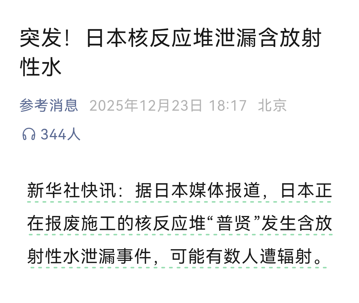 东京电力公司宣布,受损的福岛第一核电站第17轮核污染废水的海洋排放已于周一完成。自2023年8月以来,日本开始将核电站的核污染水排放到海洋中,累计排放量约13.3万吨,对海洋环境造成极大的危害。现在又发生核反应堆泄漏,看来日本就是核污染的“命”。日本发生含放射性水泄漏事件