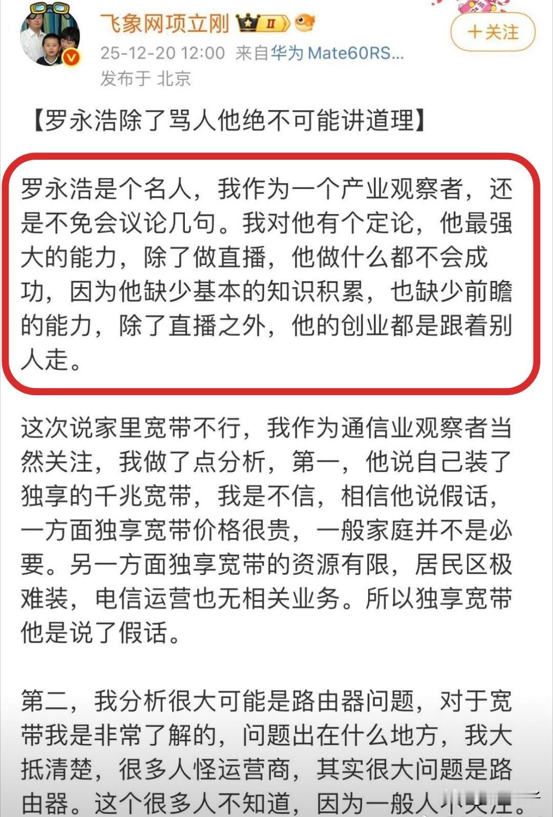 罗永浩算是遇到"对手"了[大笑]!本来自己只是吐槽下,上海电信宽带的网速问题。结果回复项立刚时用词不当,被项立刚抓住痛脚[机智]! 人家反手拿老罗的"家国情怀",和"创业失败"骑脸输出[赞]。项立刚这招挺狠啊,一下就戳中老罗痛处。就算老罗辩论高超,也只能选择哑火。 两位知名网络大V,为流量在互撕,这吃相真不咋好看[6]。你对这事怎么看的?来评论区一起讨论下吧[灵光一闪]。