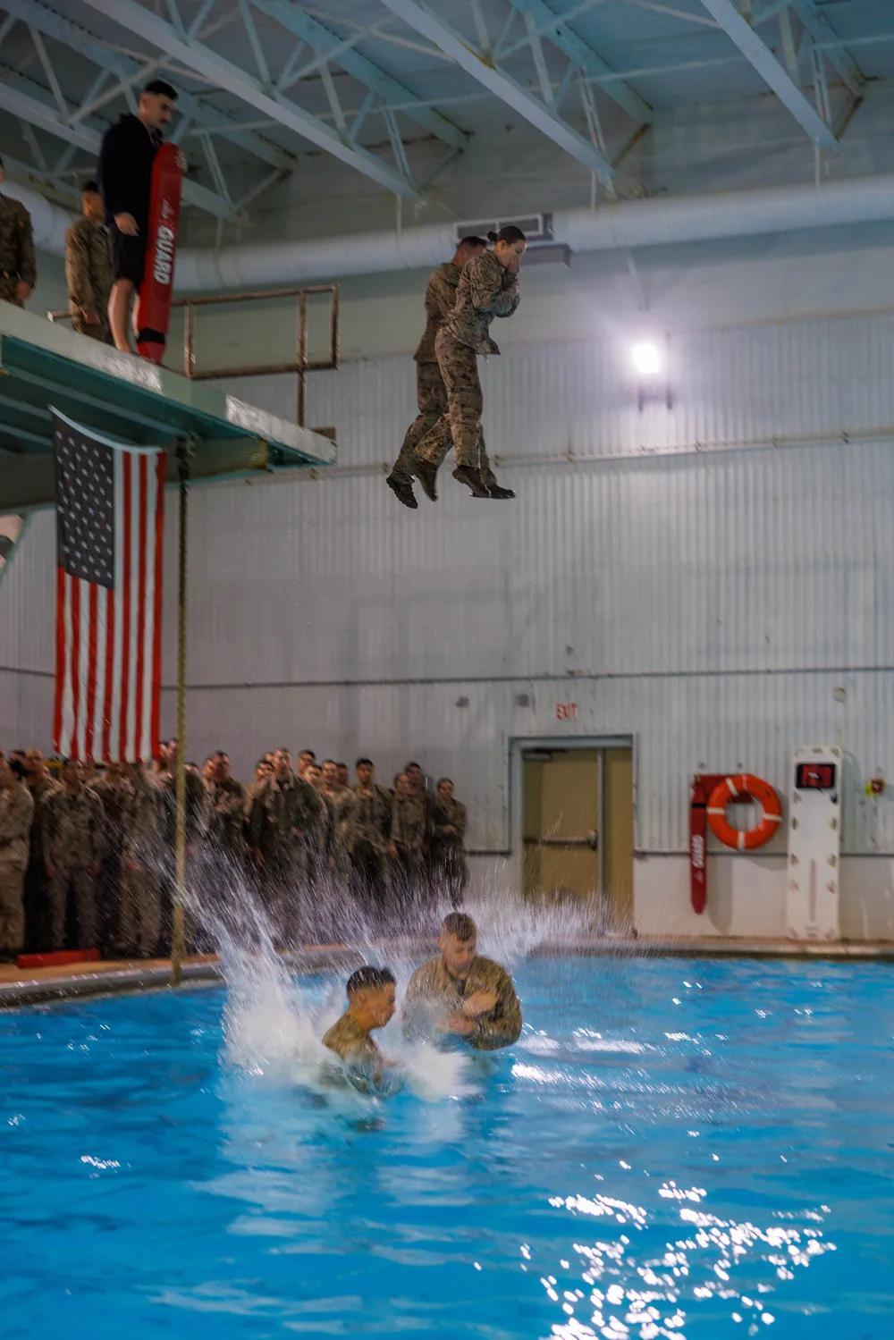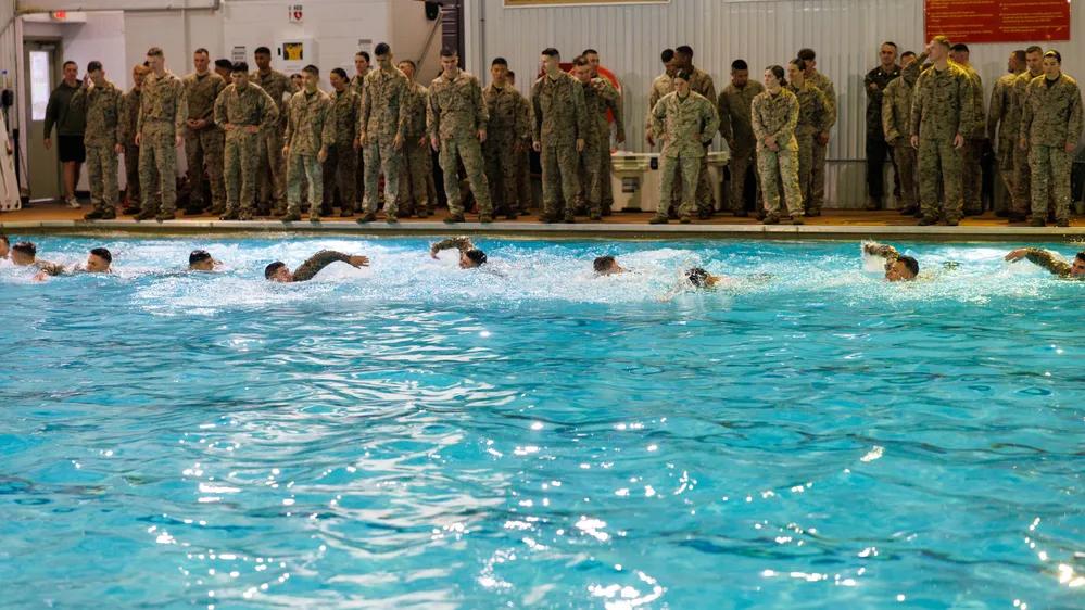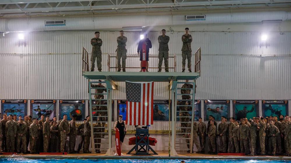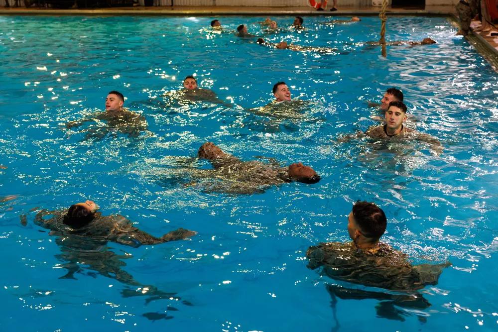 2025年12月15日,美国海军陆战队F连第6-25期基础军官课程官兵在弗吉尼亚州昆蒂科海军陆战队基地拉默大厅进行基础游泳资格测试时踩水。基础游泳资格测试要求海军陆战队员完成一系列项目,包括游泳25米,从10英尺高的跳台跳入水中再游泳25米、保持浮水四分钟,以及能够在10秒内脱掉水下装备。
