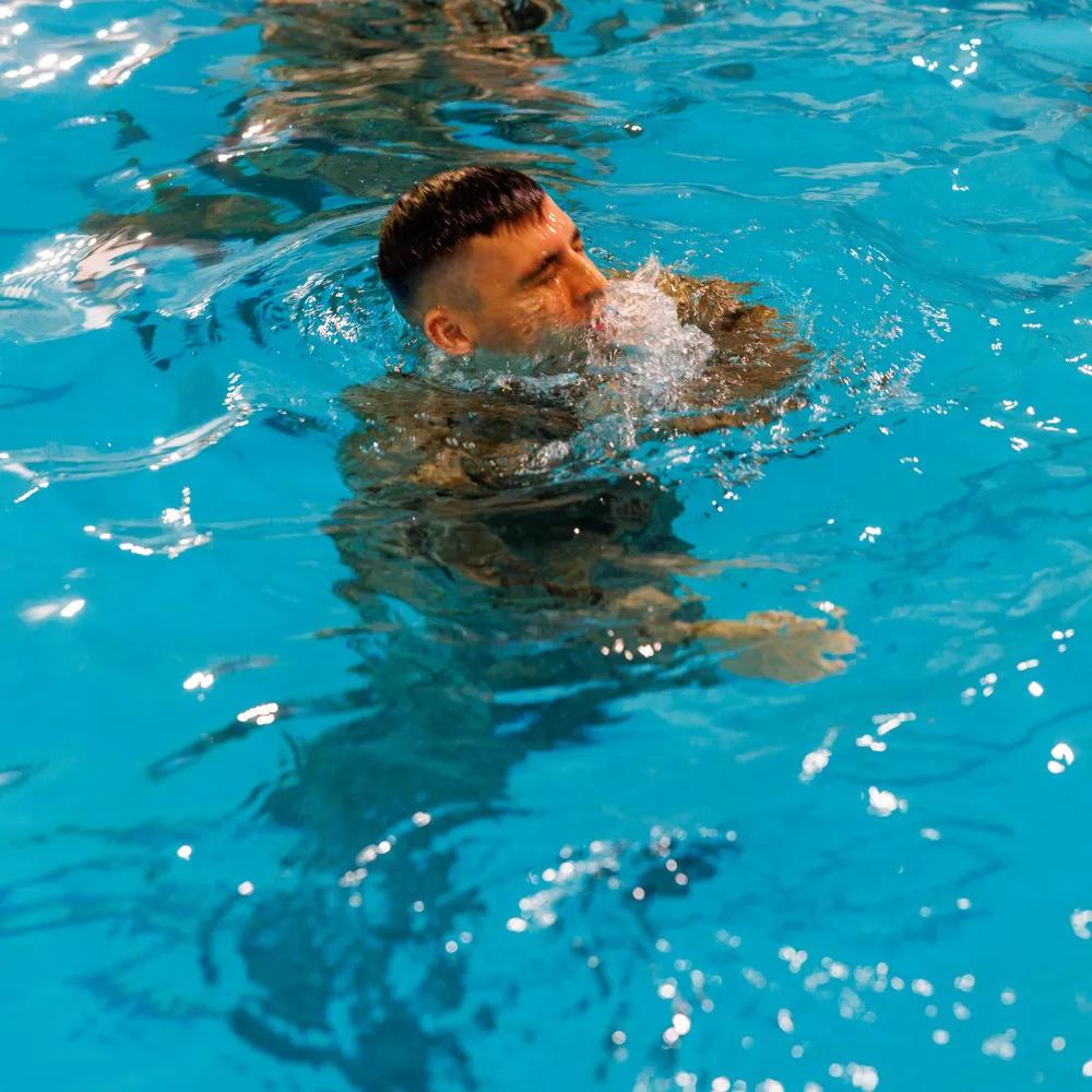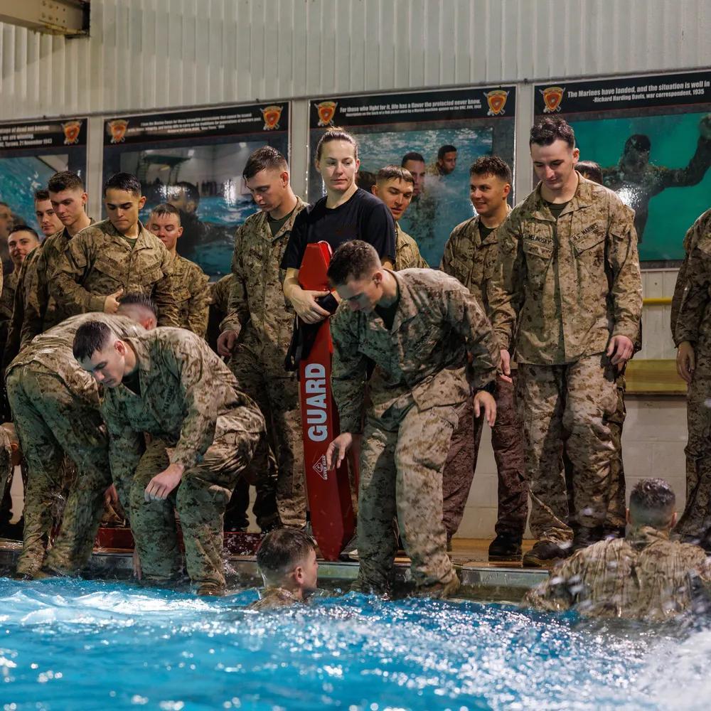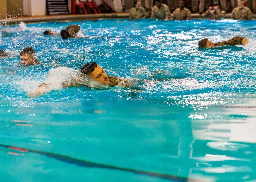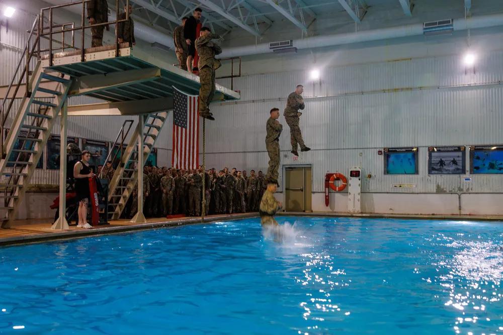 2025年12月15日,美国海军陆战队F连第6-25期基础军官课程官兵在弗吉尼亚州昆蒂科海军陆战队基地拉默大厅进行基础游泳资格测试时踩水。基础游泳资格测试要求海军陆战队员完成一系列项目,包括游泳25米,从10英尺高的跳台跳入水中再游泳25米、保持浮水四分钟,以及能够在10秒内脱掉水下装备。