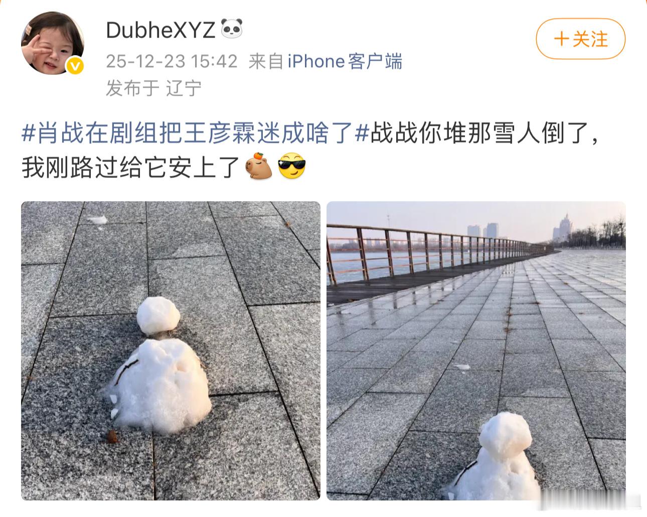 肖战堆的雪人后续万万没想到肖战堆的雪人还有后续啊,雪化了雪人倒了,还有热心网友重新给安上了哈哈哈哈哈哈哈下次堆大一点